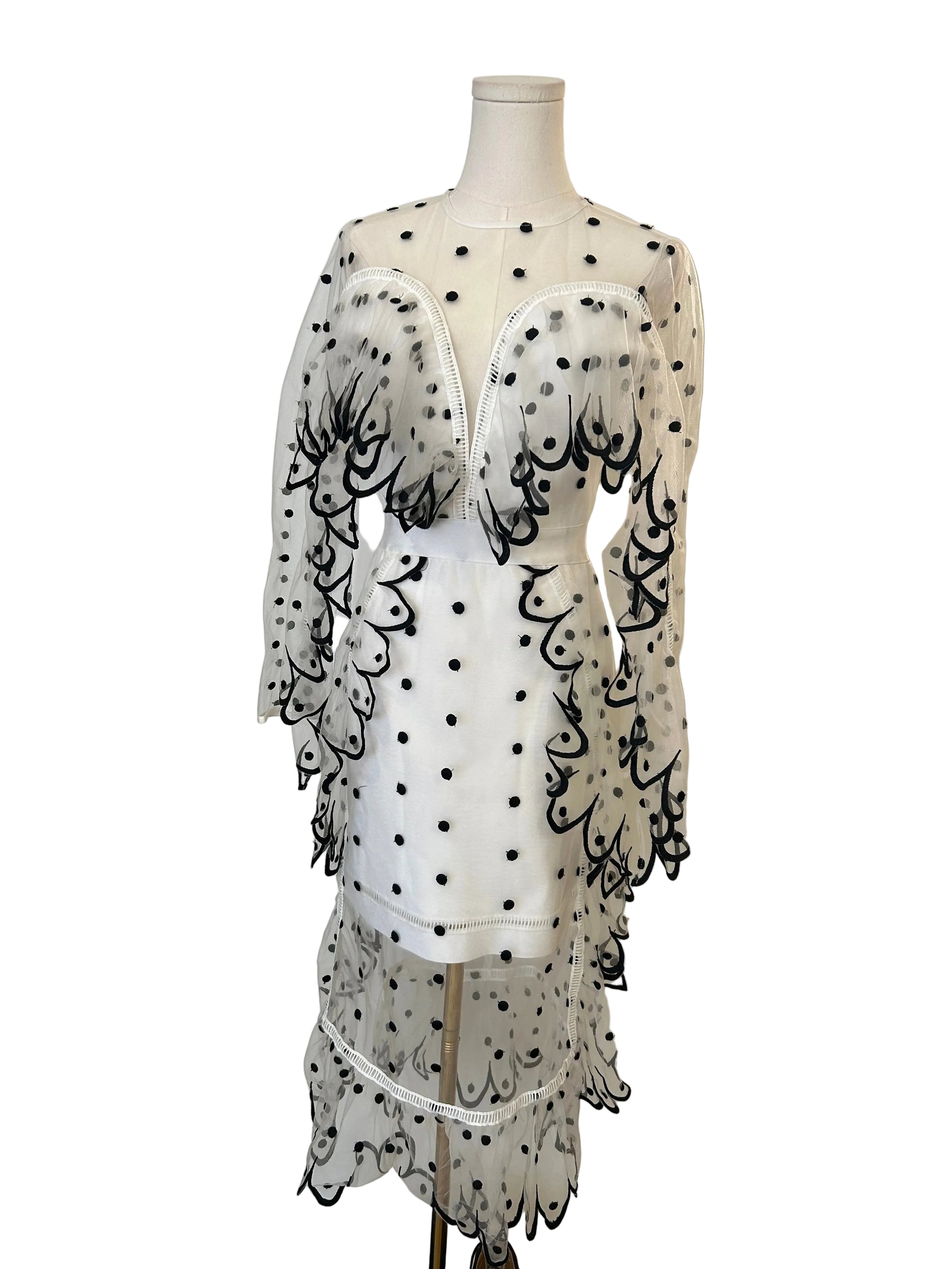 White sheer overlay with black polka dots and embroidered detailing. Features a soft sheer neckline, long statement sleeves, and a tiered hem. Elegant and eye-catching.