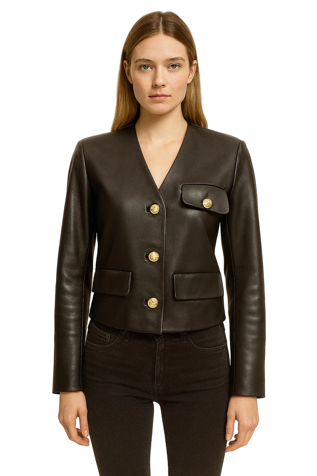 Long sleeve mid-weight non-stretch leather jacket with v neck and gold button detail. Padded shoulder. Patch front pocket.