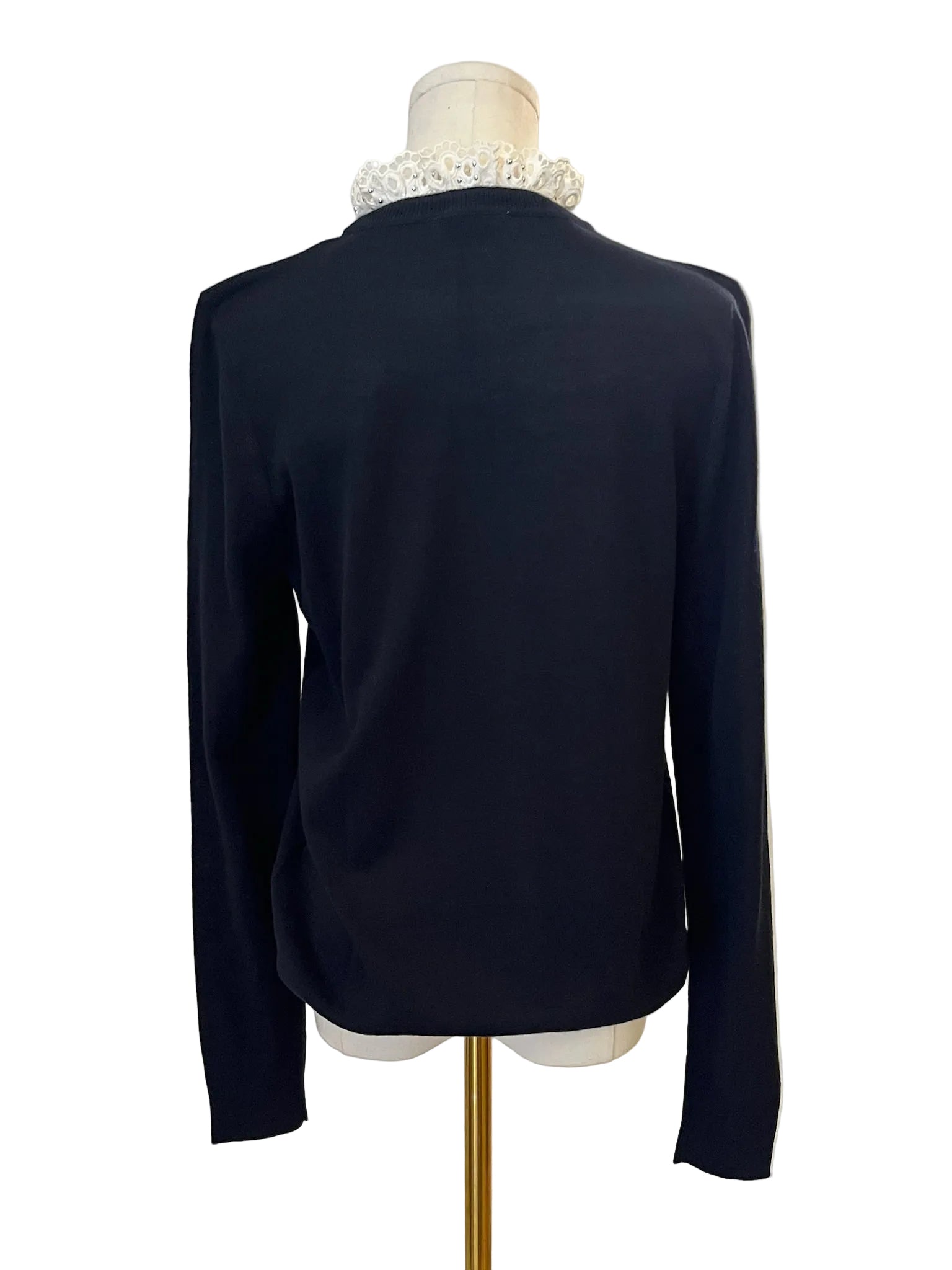 Long sleeve wool sweater with high ruffle lace collar.