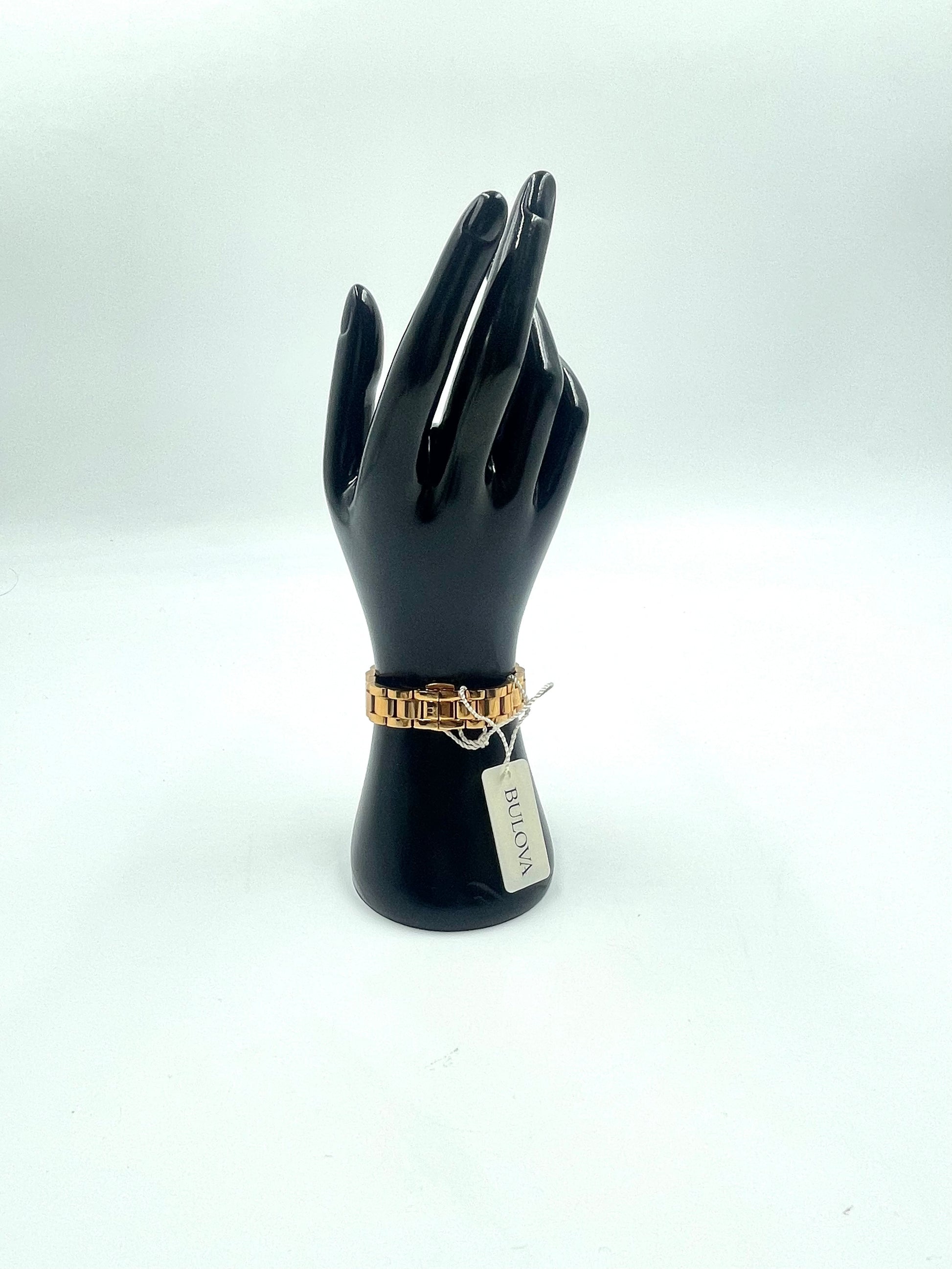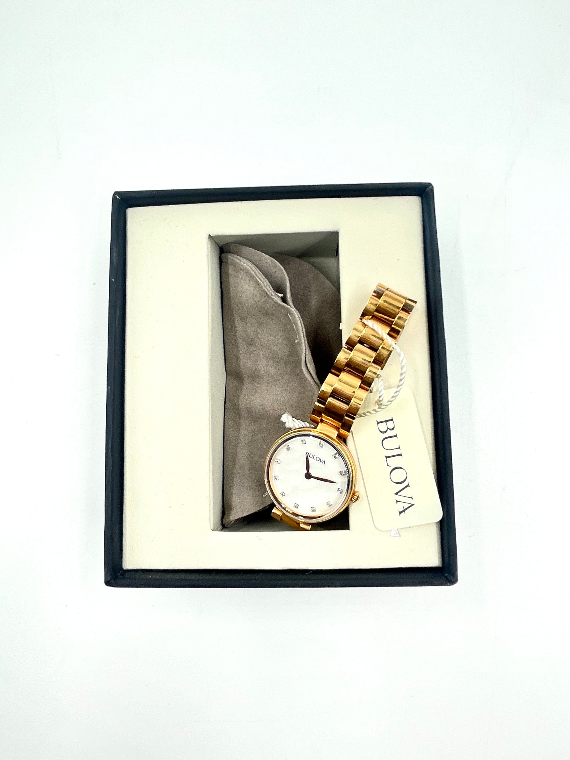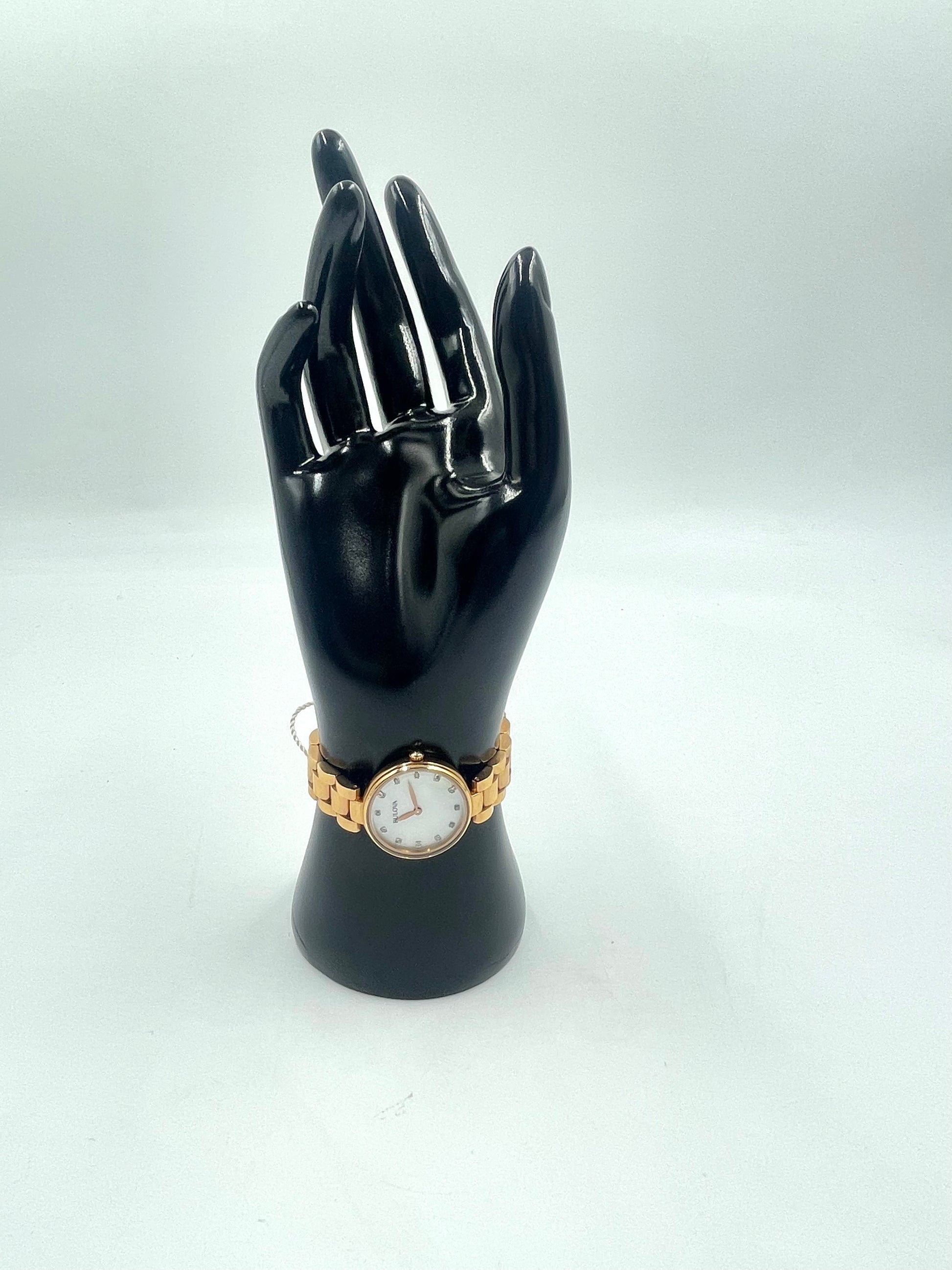Crafted in rose-toned stainless steel, this watch features a luminous mother-of-pearl dial and diamond-accent markers.