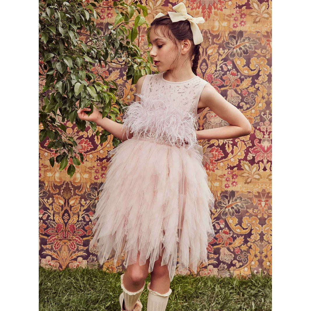 The tank style soft cotton bodice is embellished with a scattering of sparkling beads and sequins. Plumes of silky soft feathers burst from the waistline.