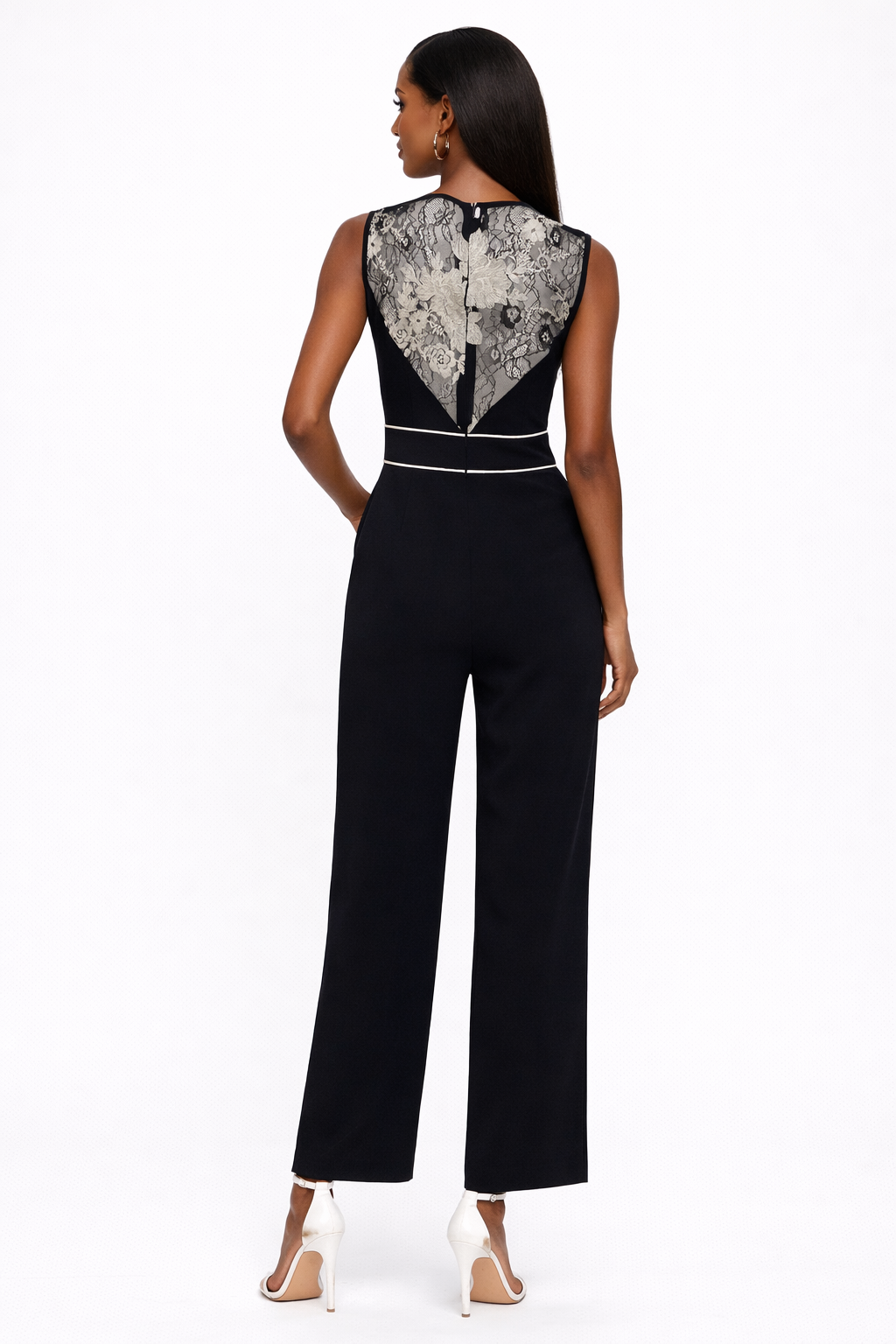 Sleeveless jumpsuit with back lace details. Back zip closure with side pockets.