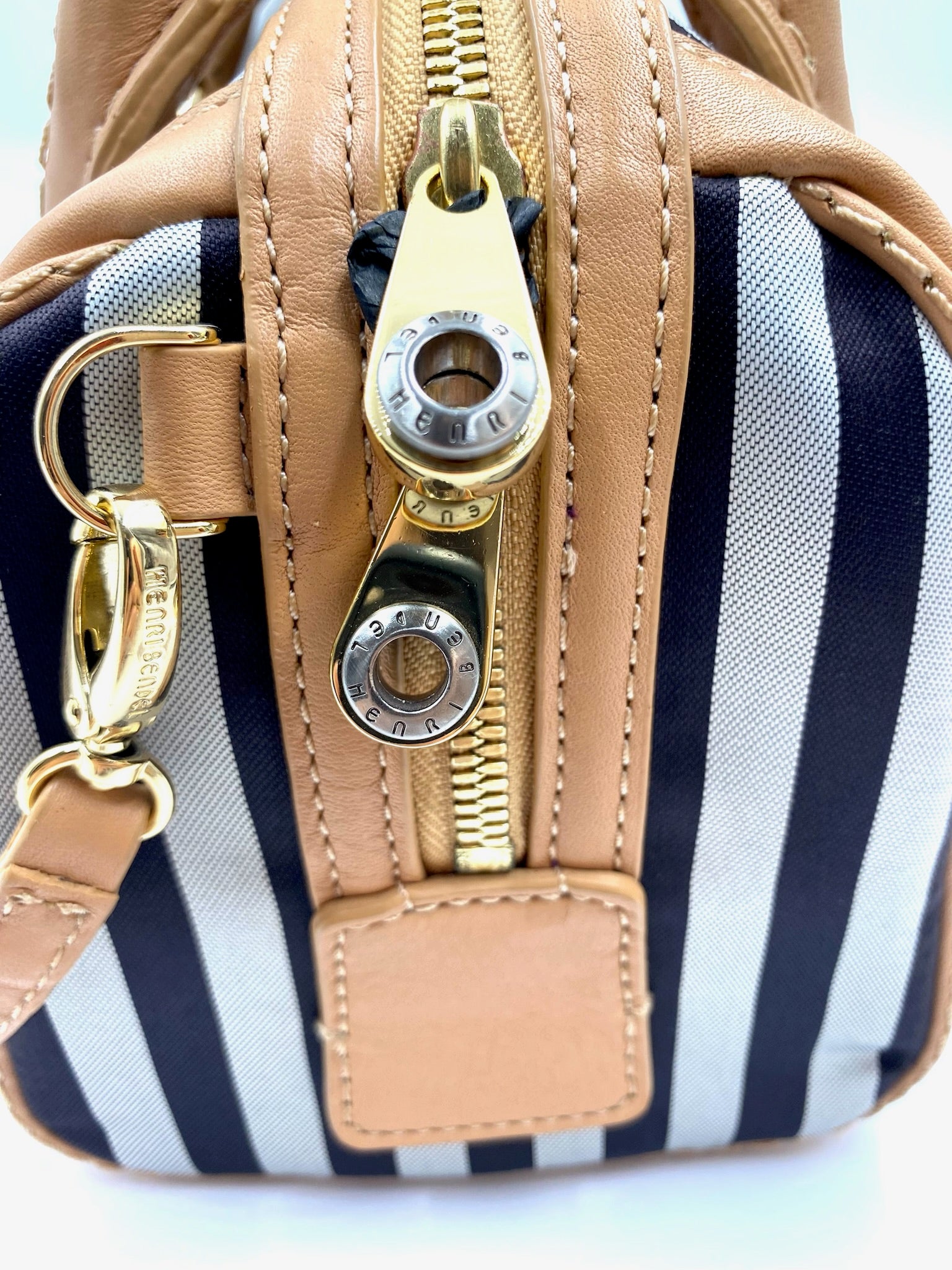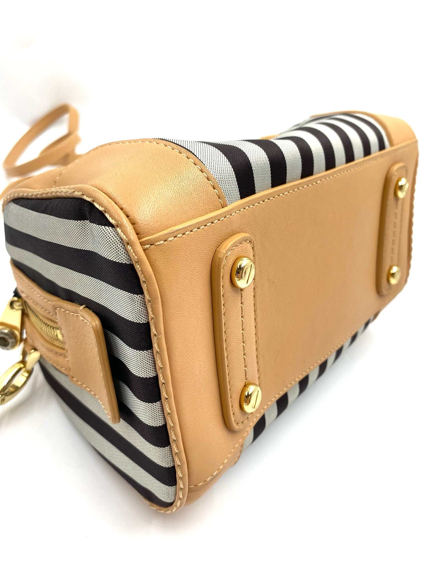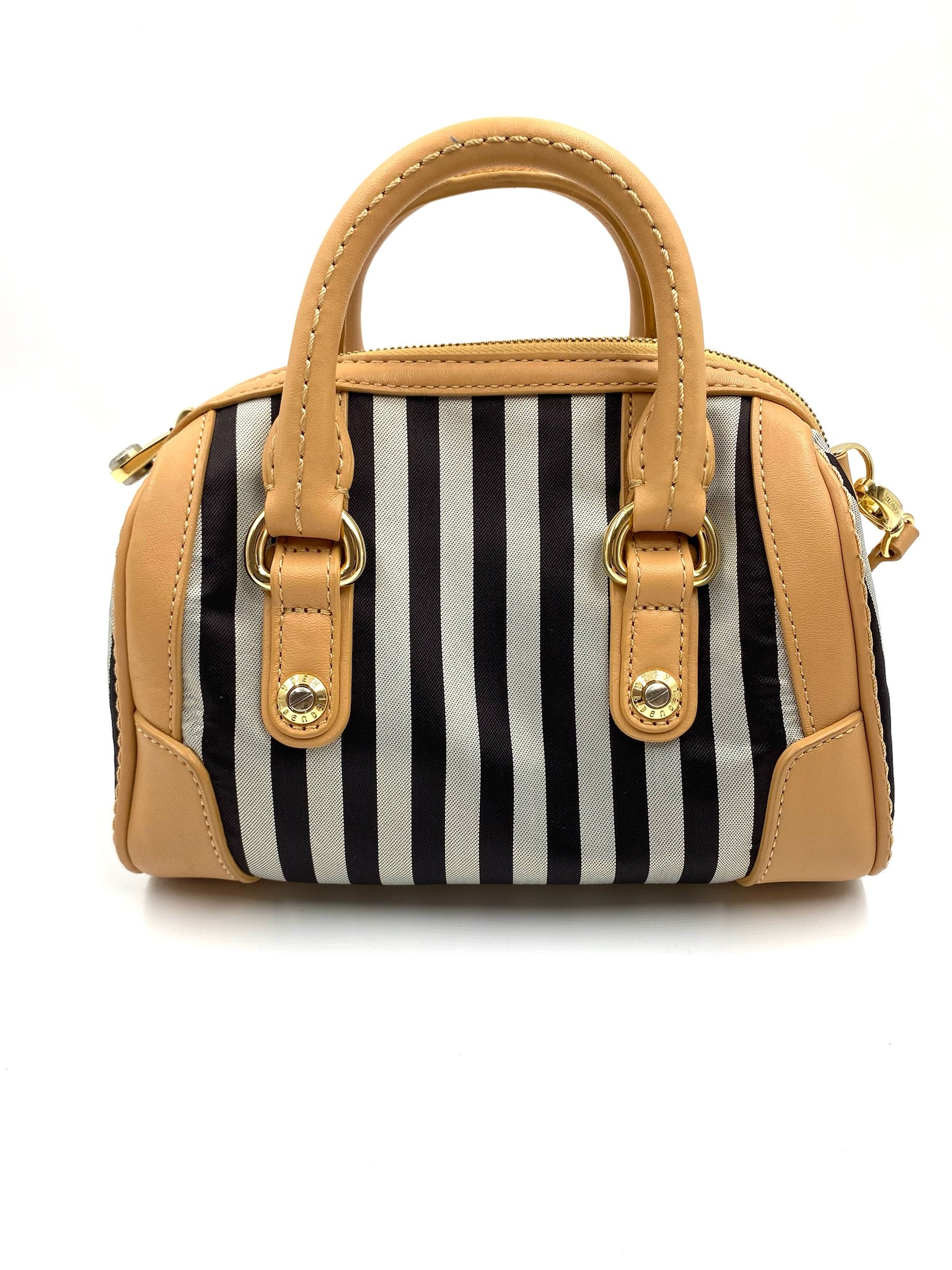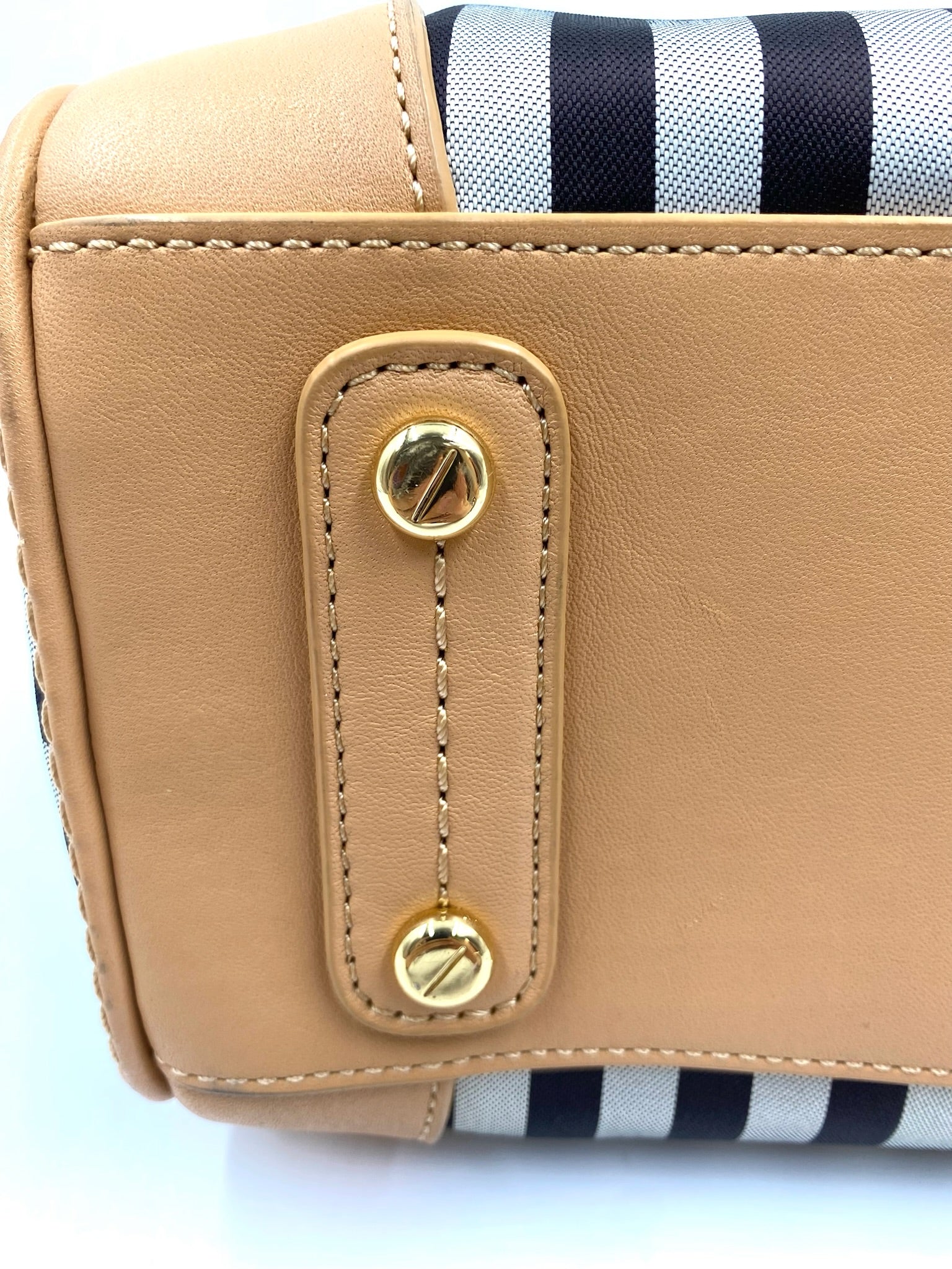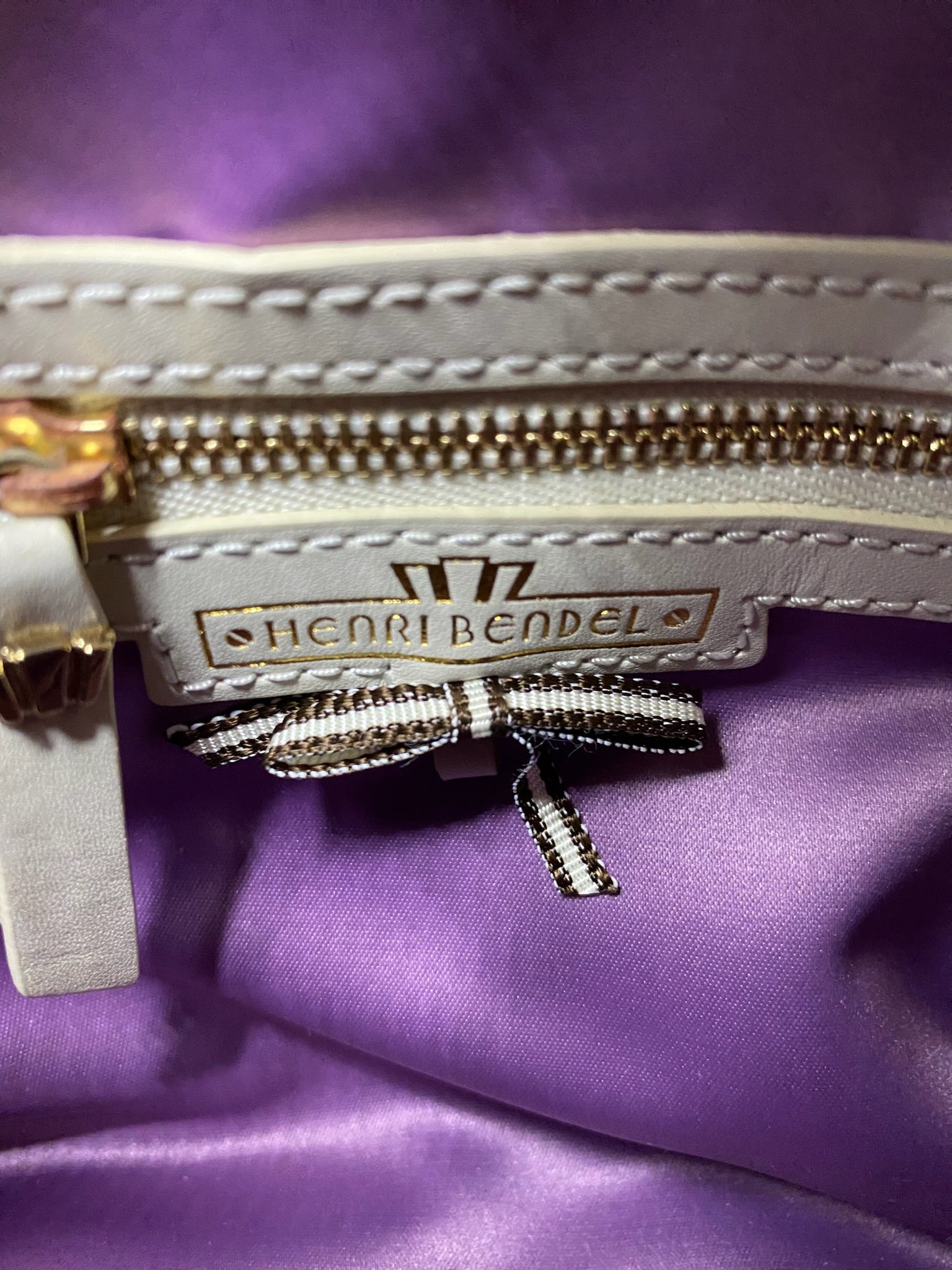Top handle bag with detachable strap. Nylon with leather trim and handle. Top zipper closure with inside zip pocket. Purple lining.
