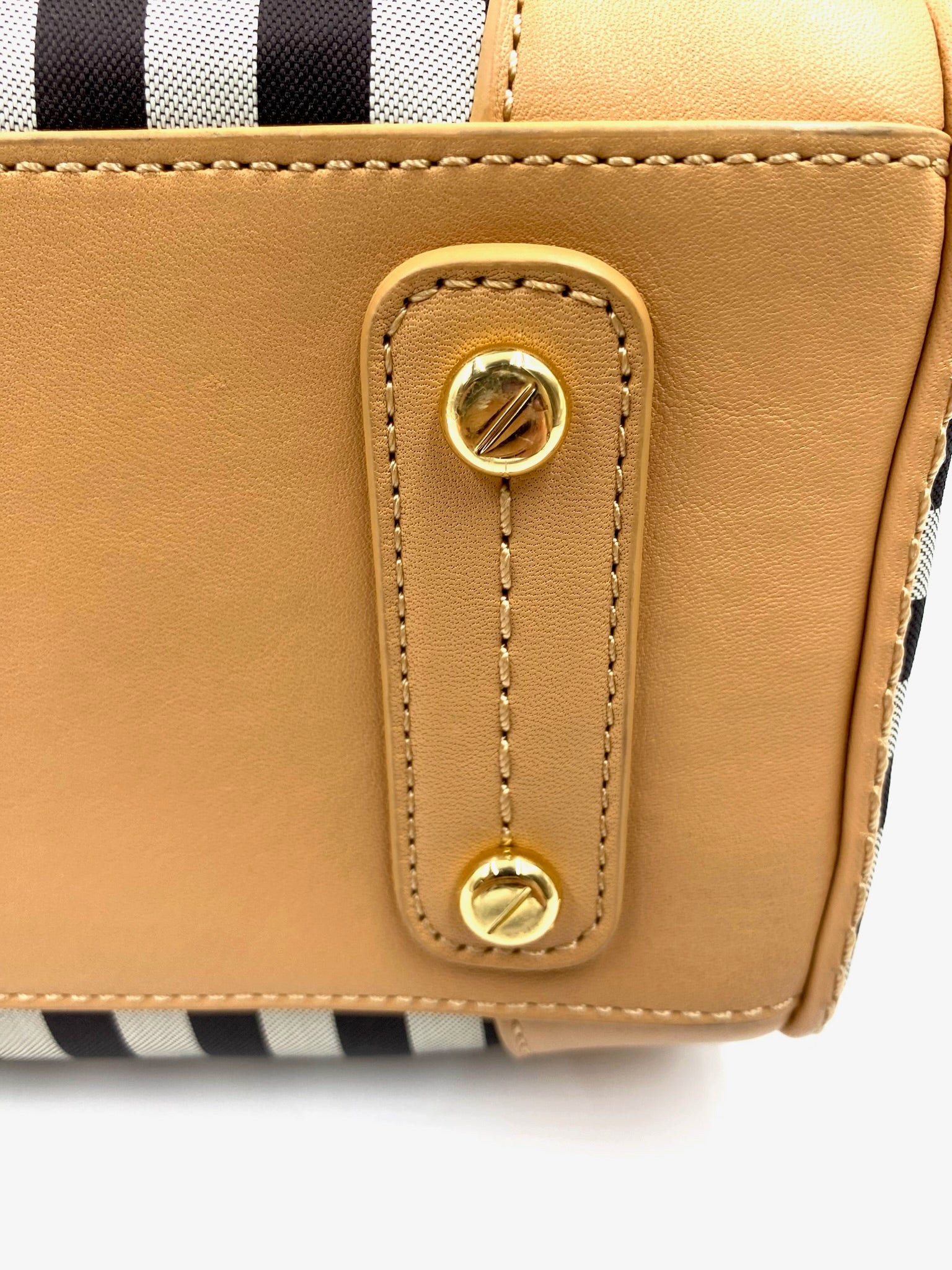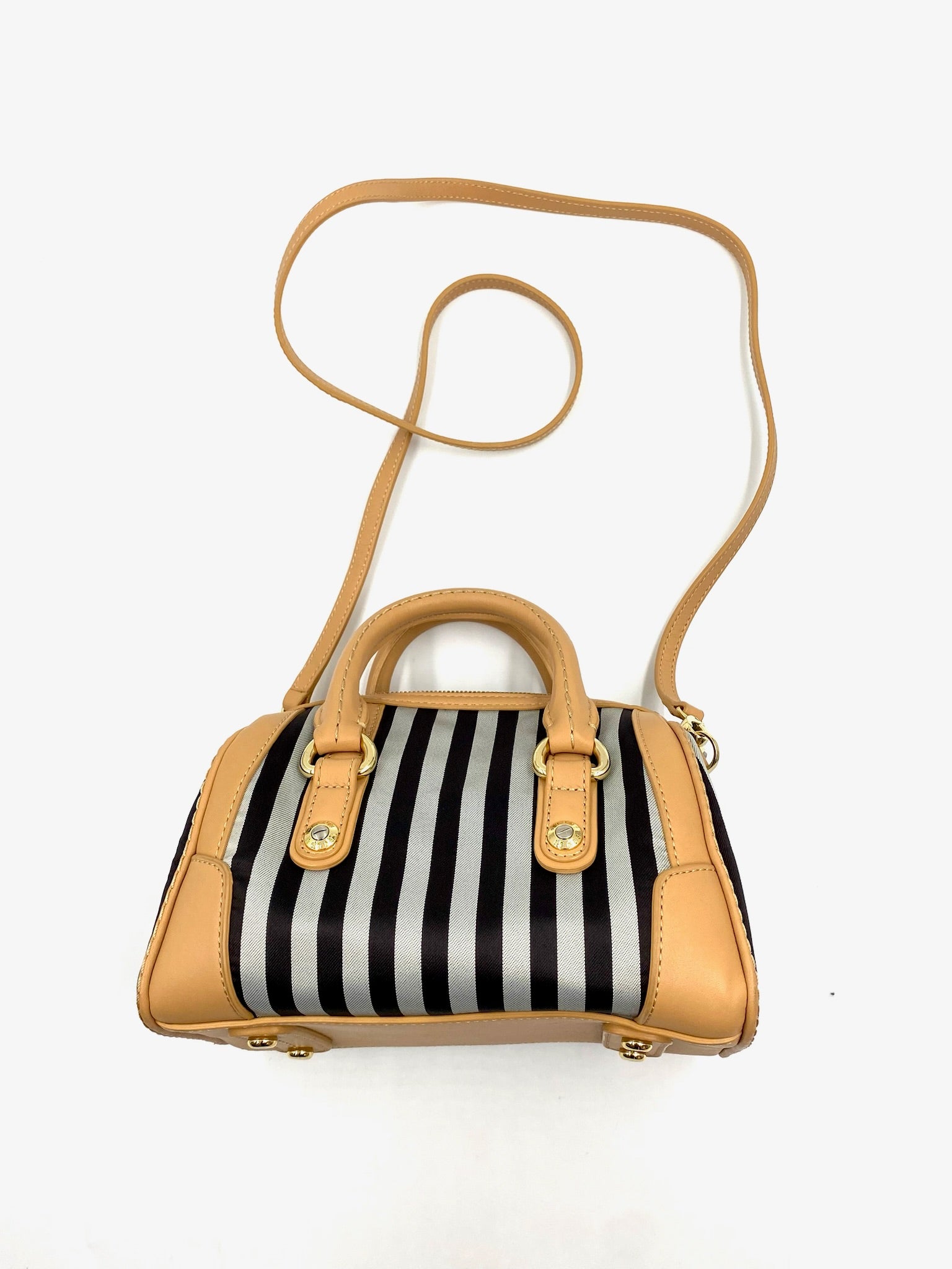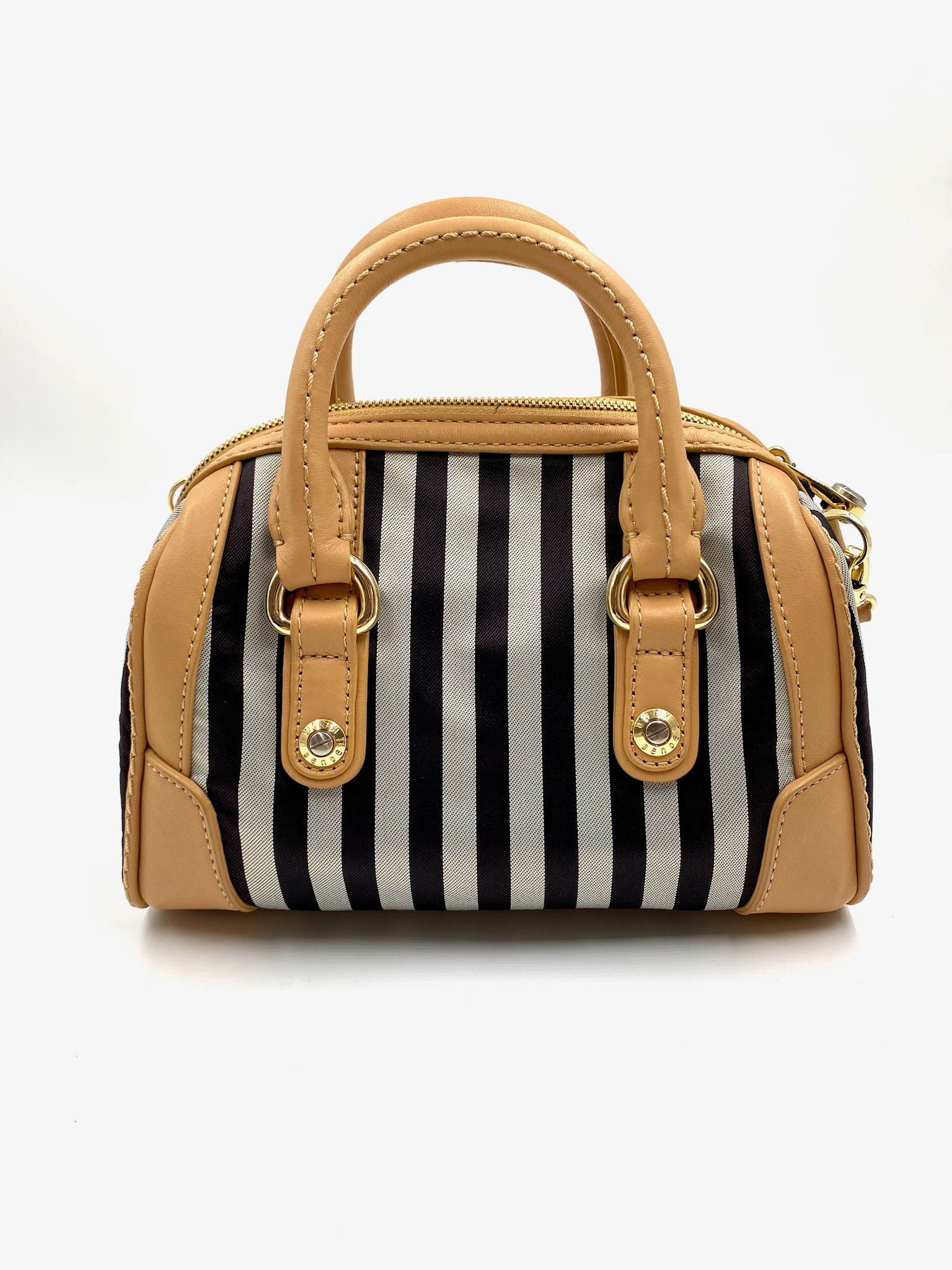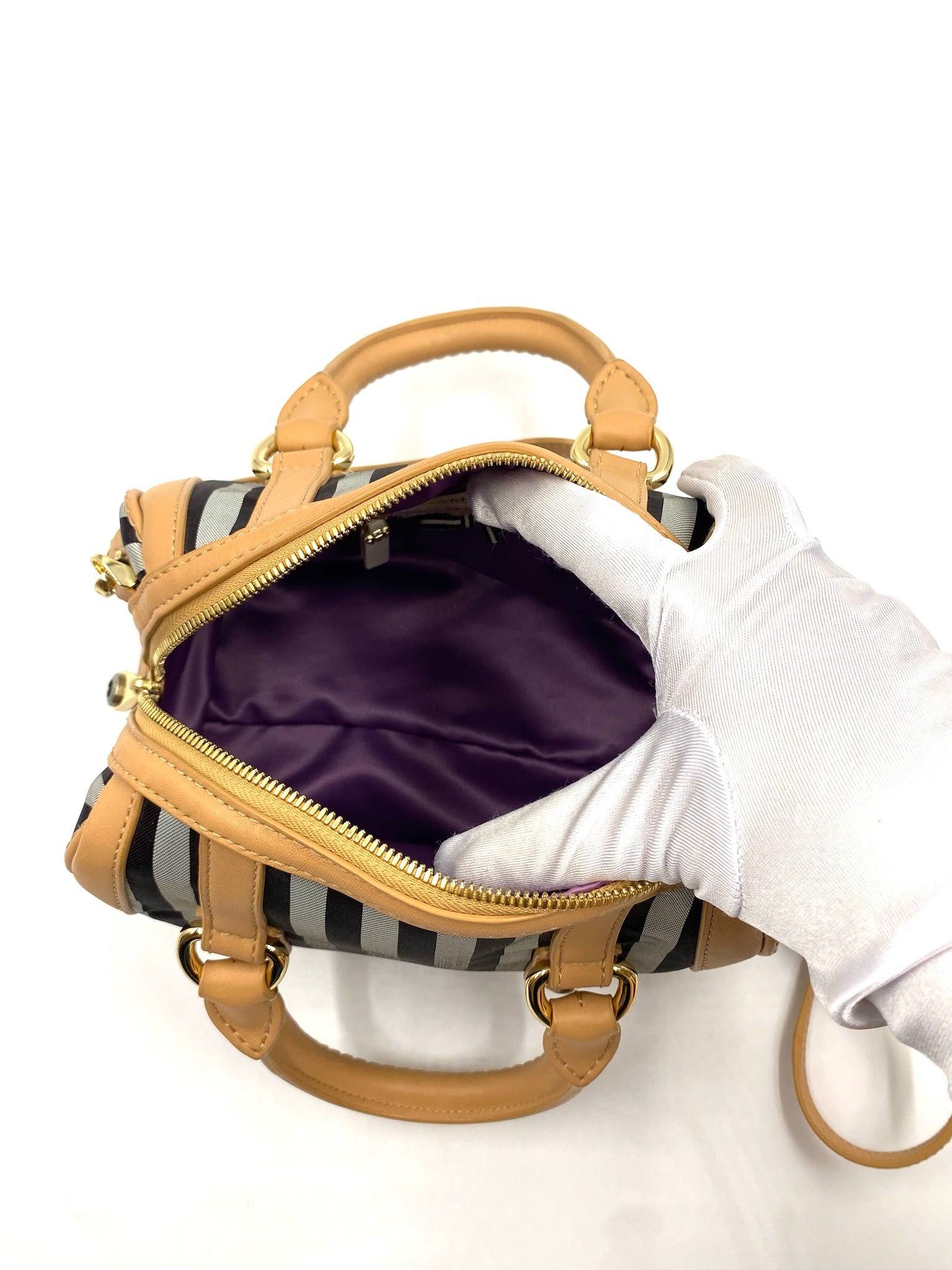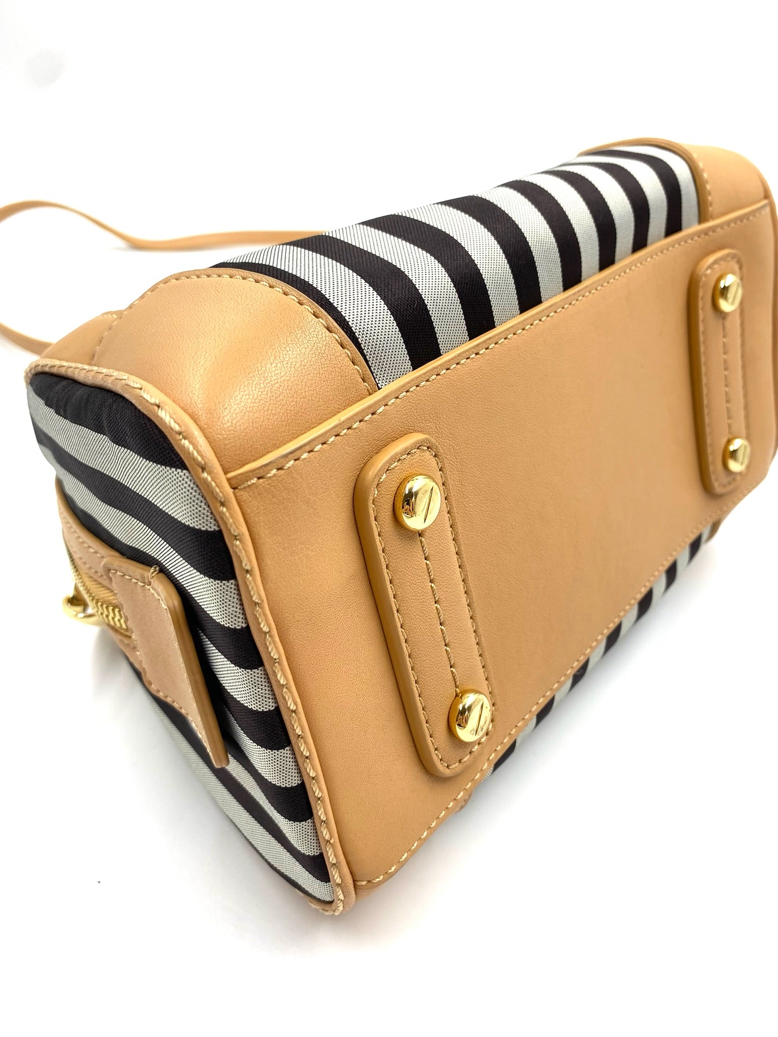 Top handle bag with detachable strap. Nylon with leather trim and handle. Top zipper closure with inside zip pocket. Purple lining.