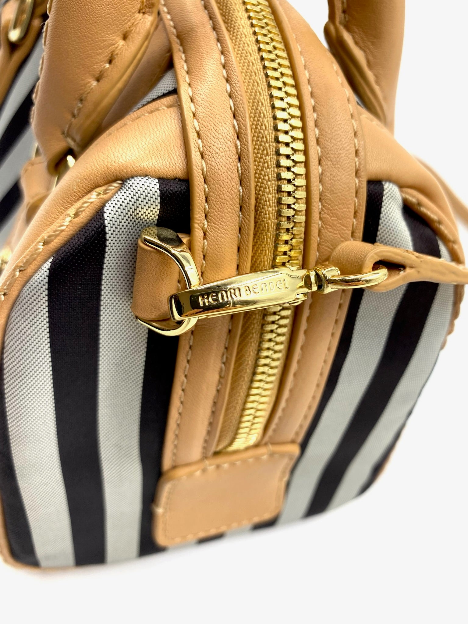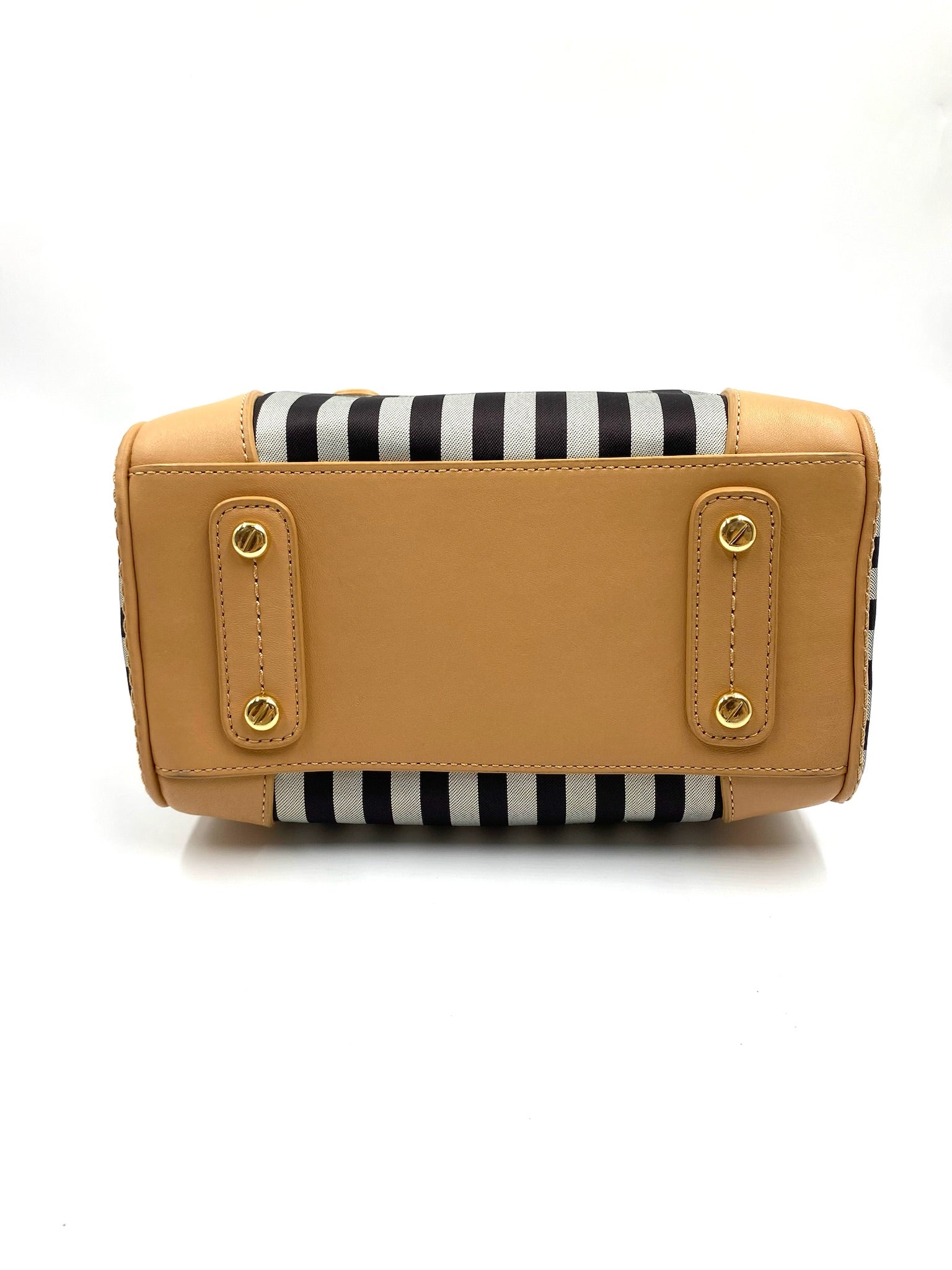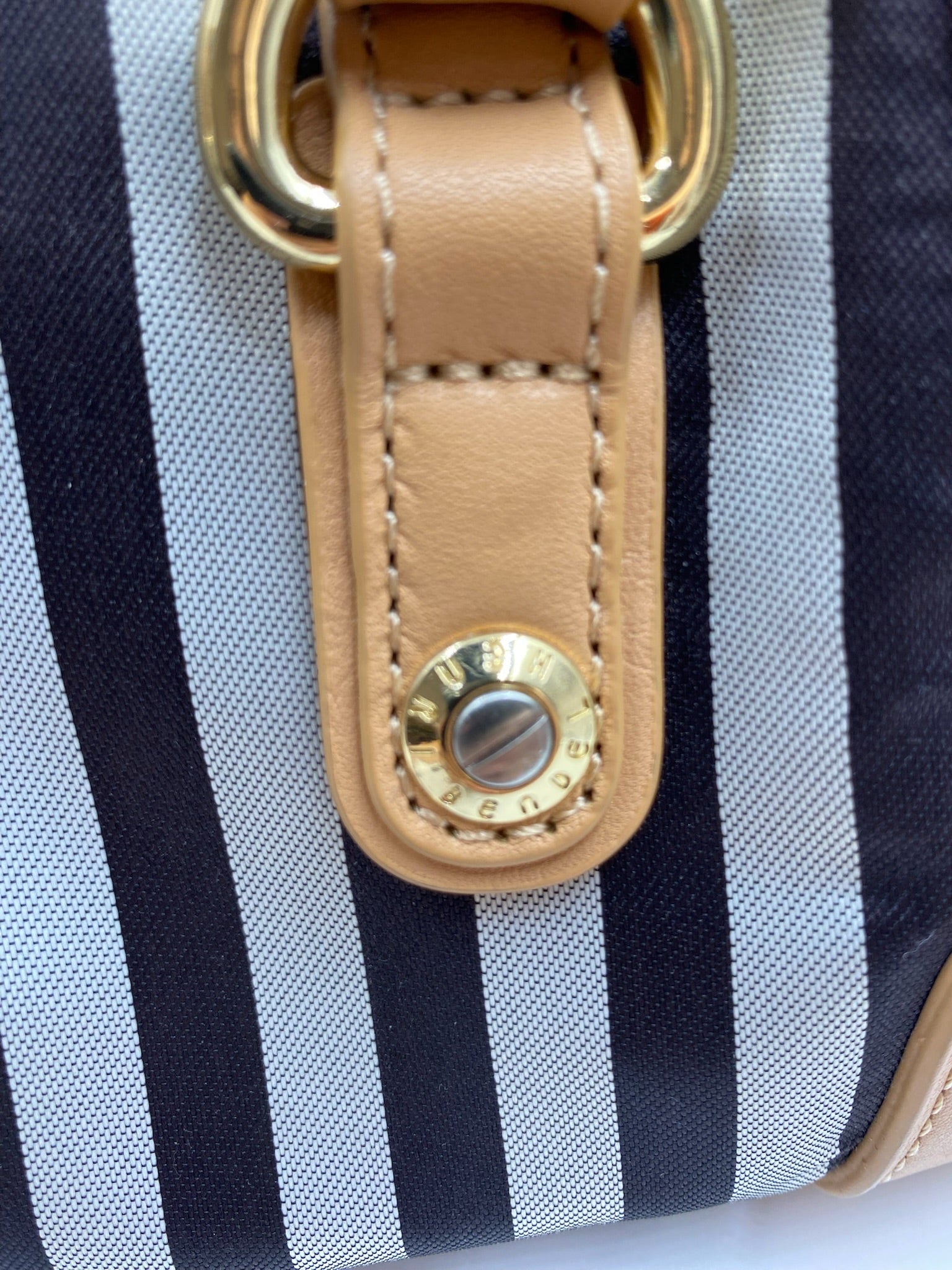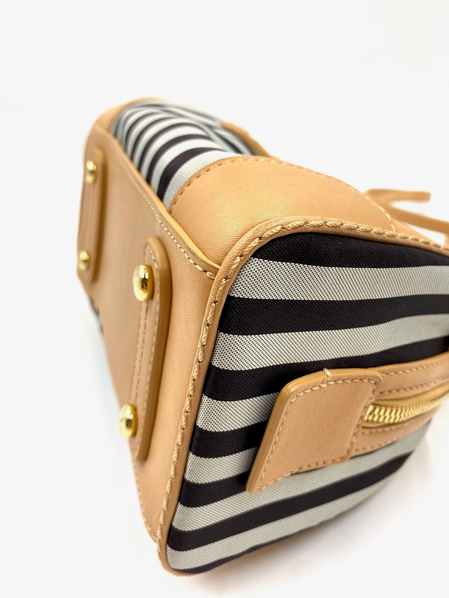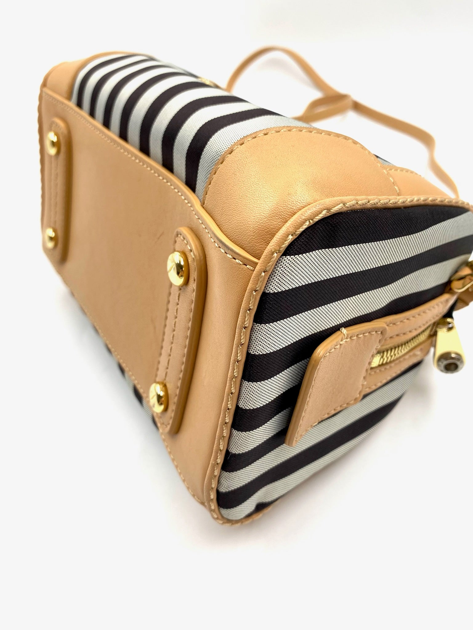 Top handle bag with detachable strap. Nylon with leather trim and handle. Top zipper closure with inside zip pocket. Purple lining.