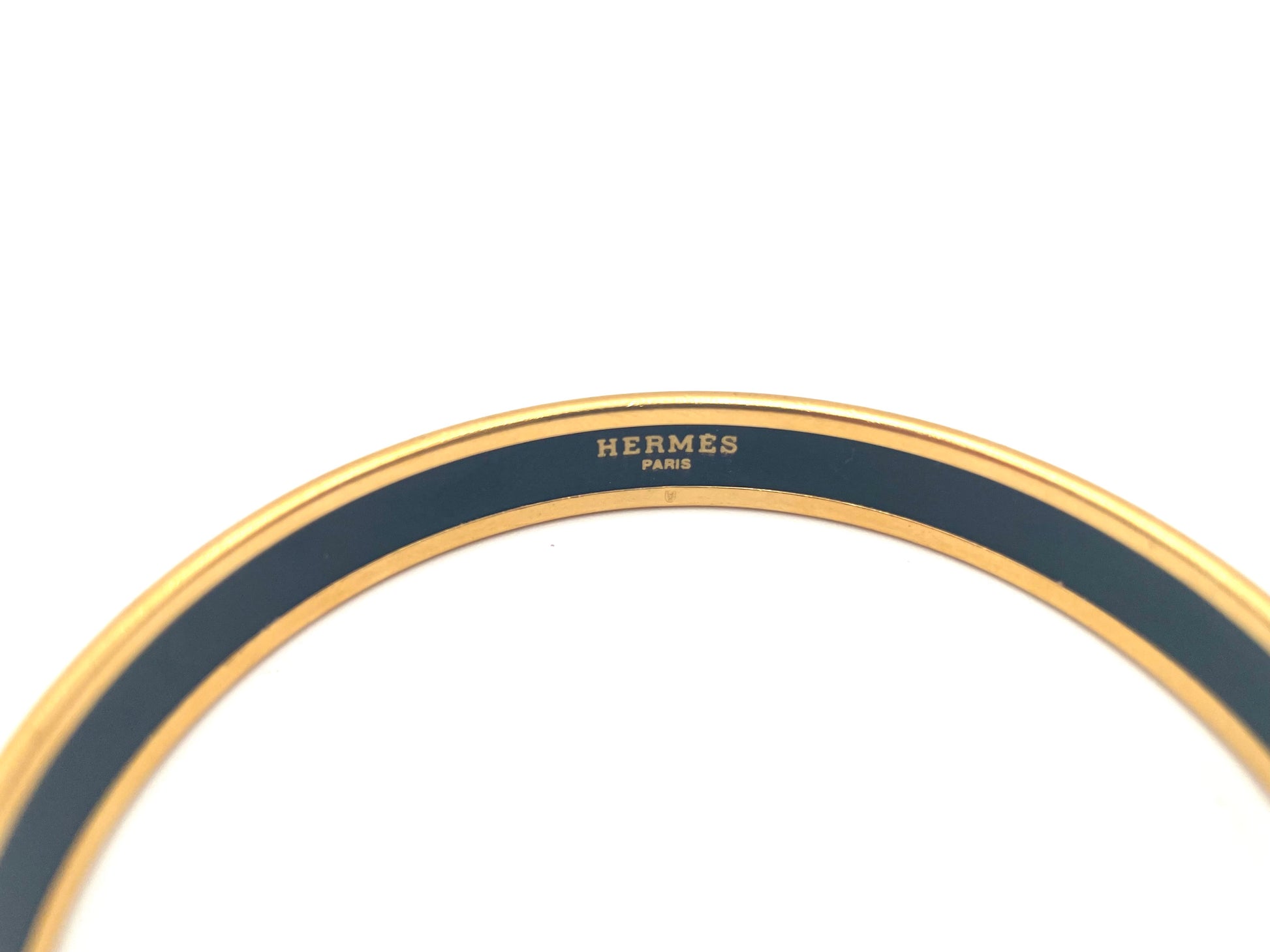 HERMES Enamel Narrow Printed Chain D Ancre Bracelet in Black. This chic bangle bracelet is enameled black inside and has a gold rim both interior and exterior with a Hermes signature.
