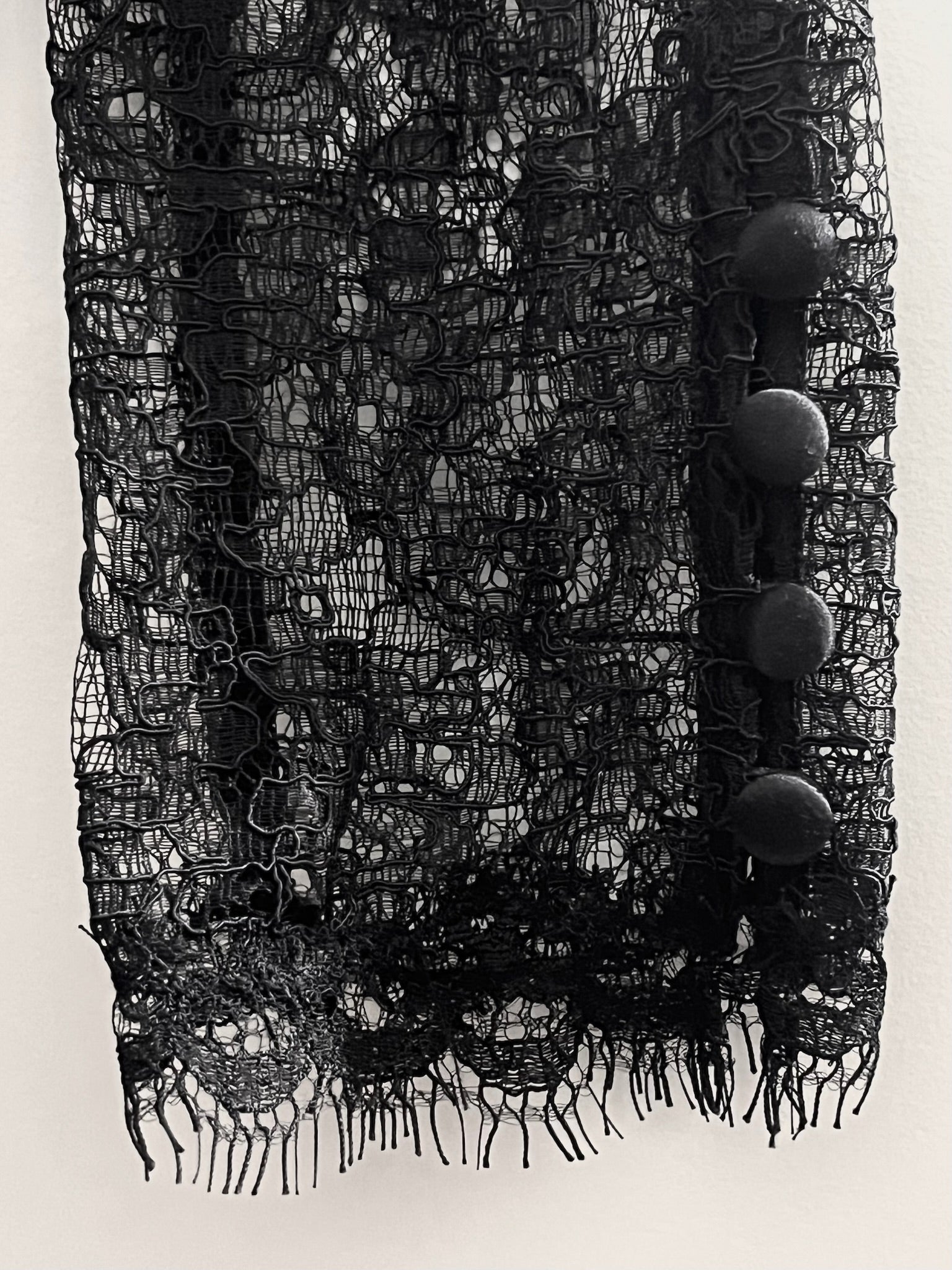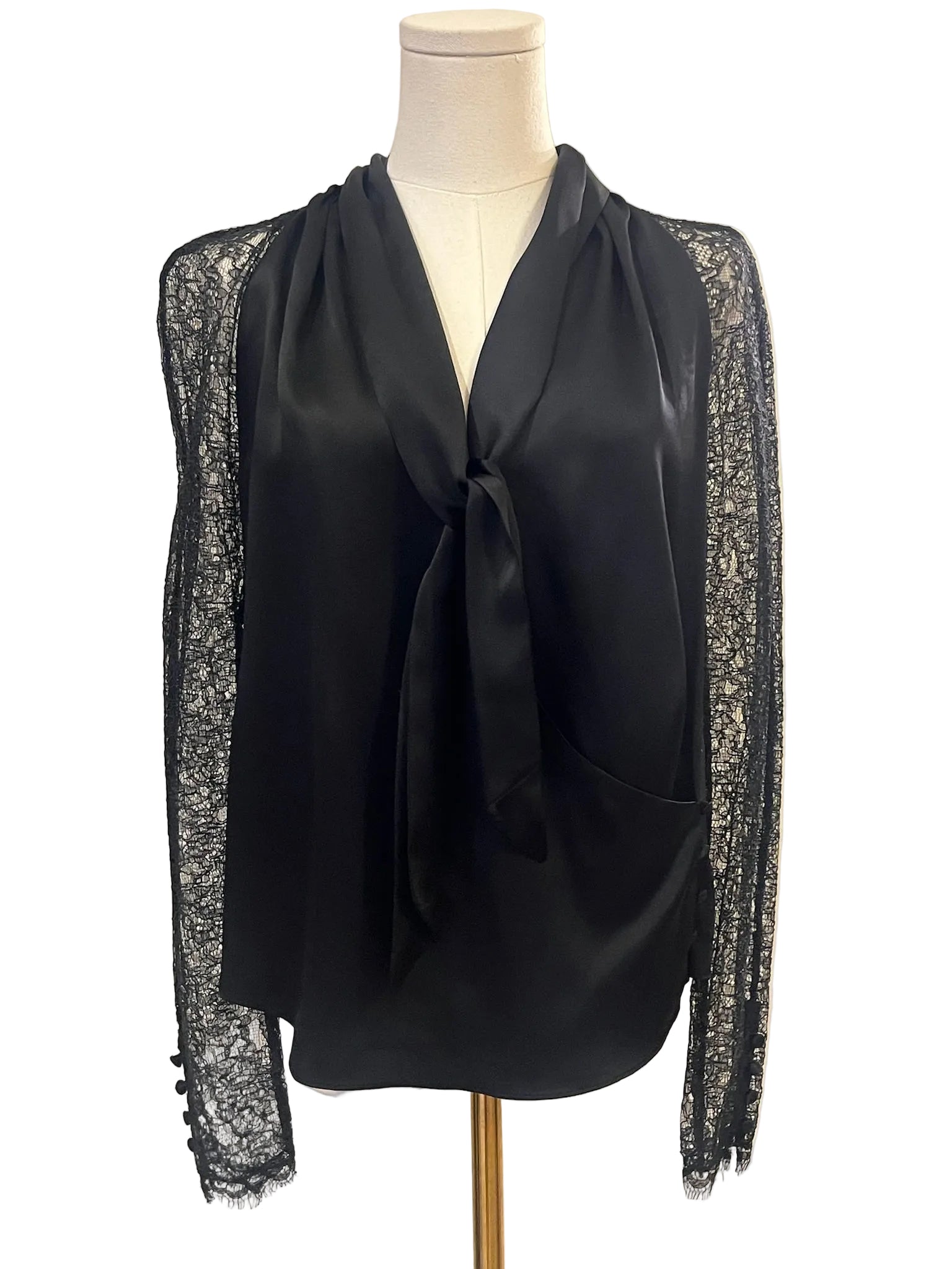 Long sleeve lace sleeve blouse with neck tie and button sleeve detail.