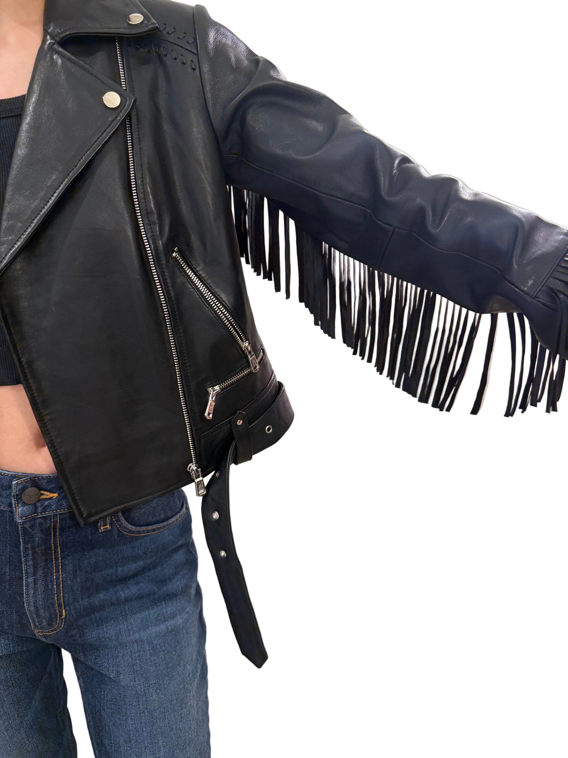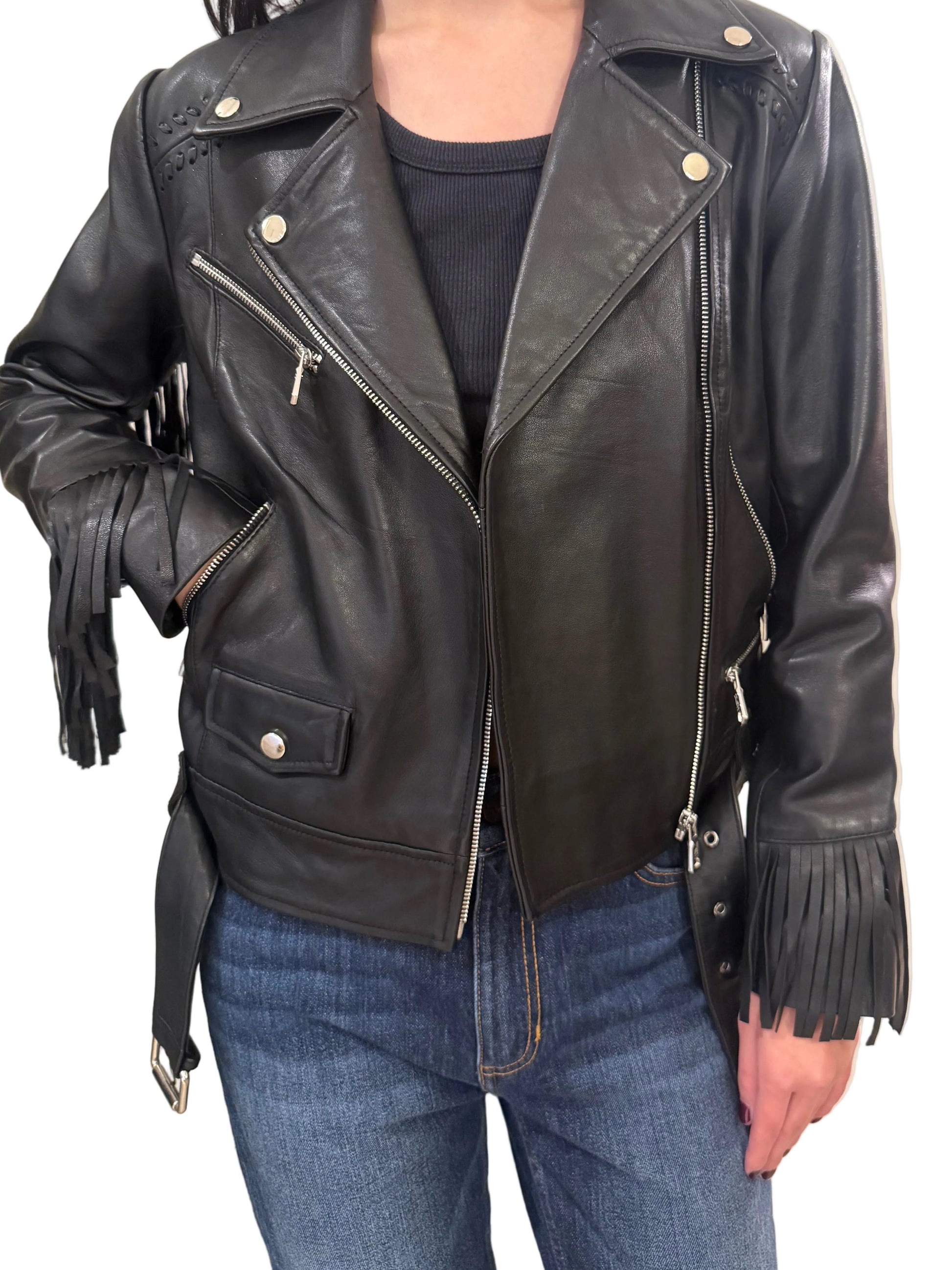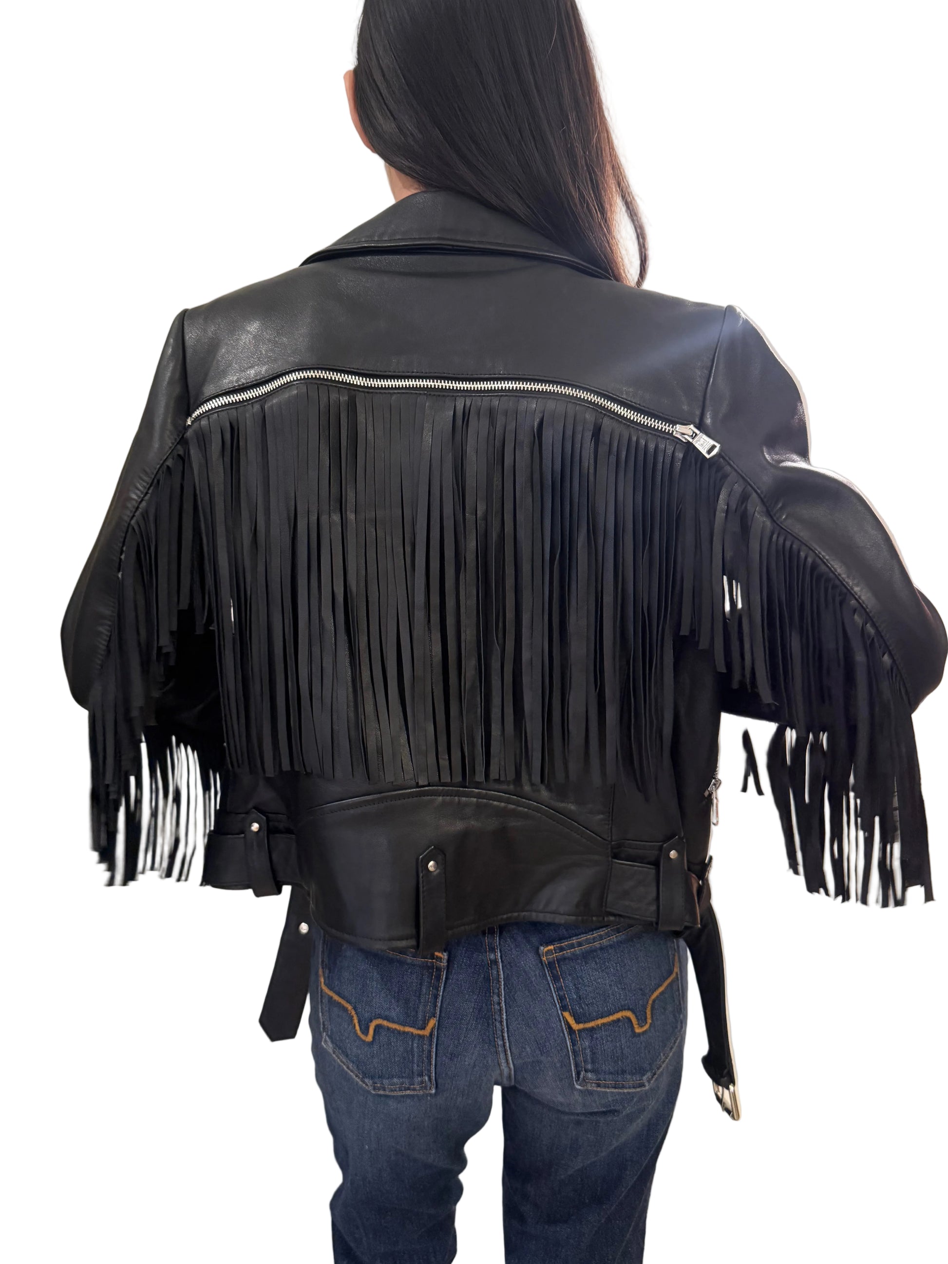 This classic moto jacket with a twist is a must have. With a removable fringe across back its the most versatile Jacket.