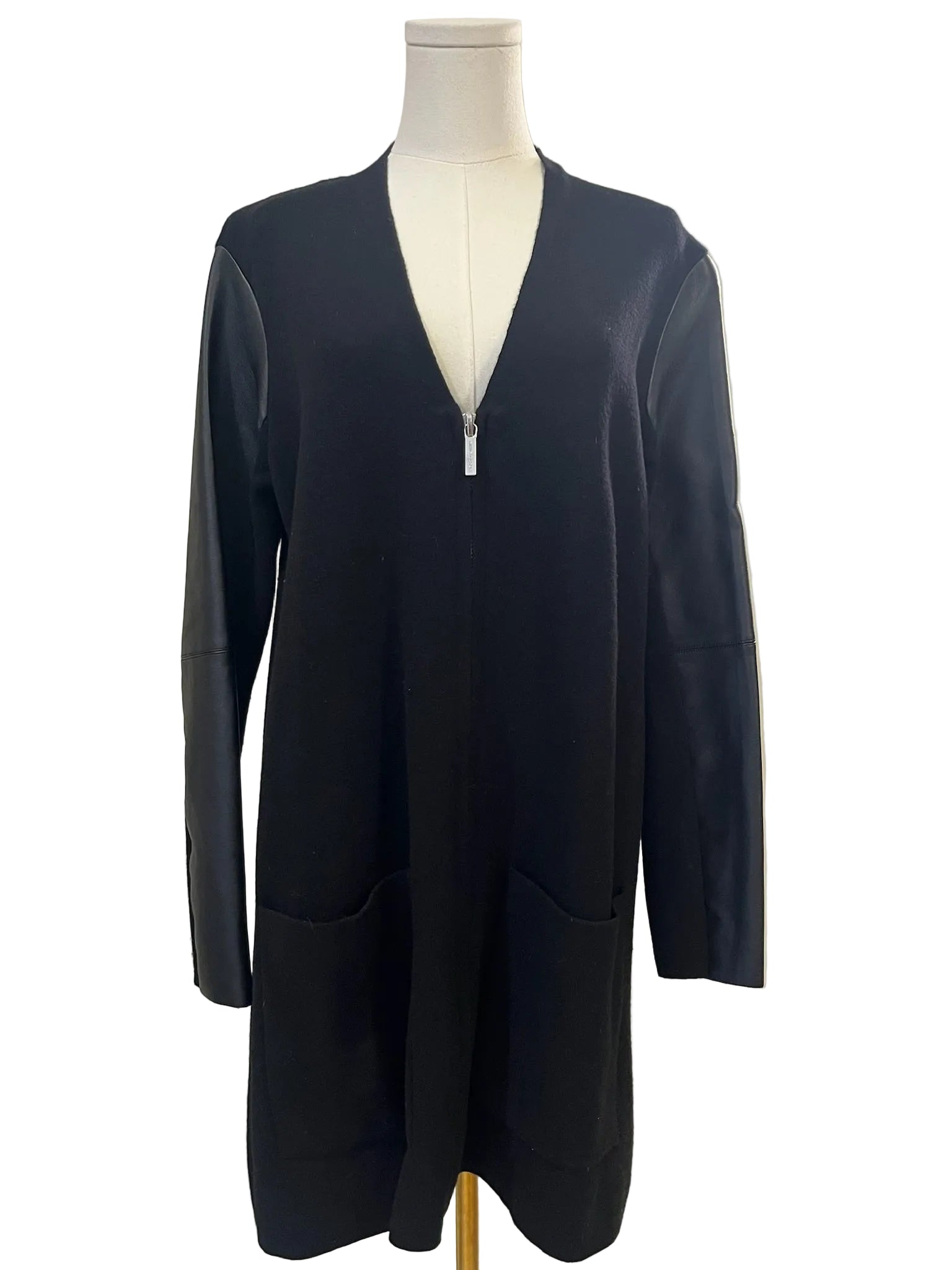 Long sleeve sweater with 2 front pockets and zipper closure.