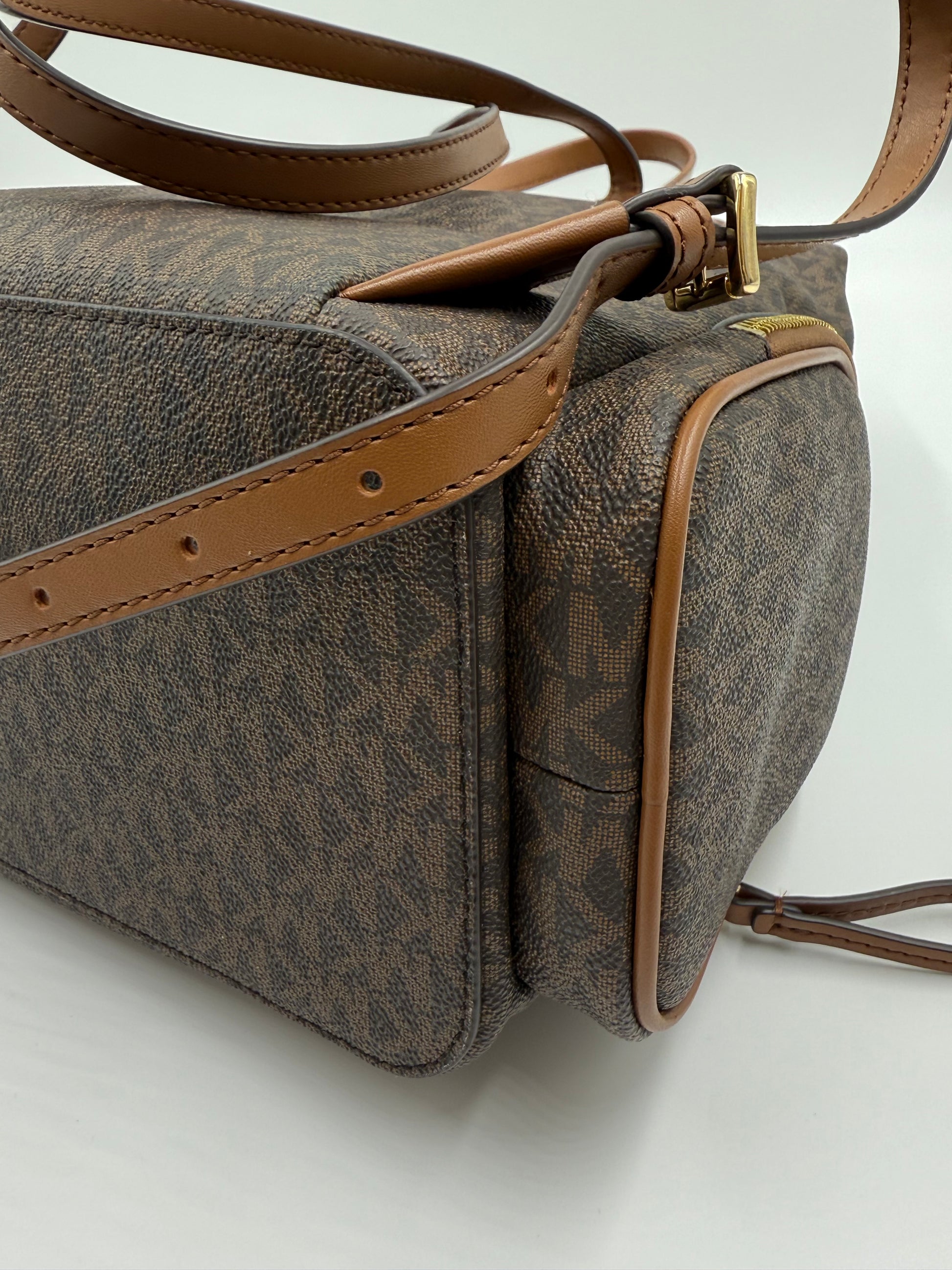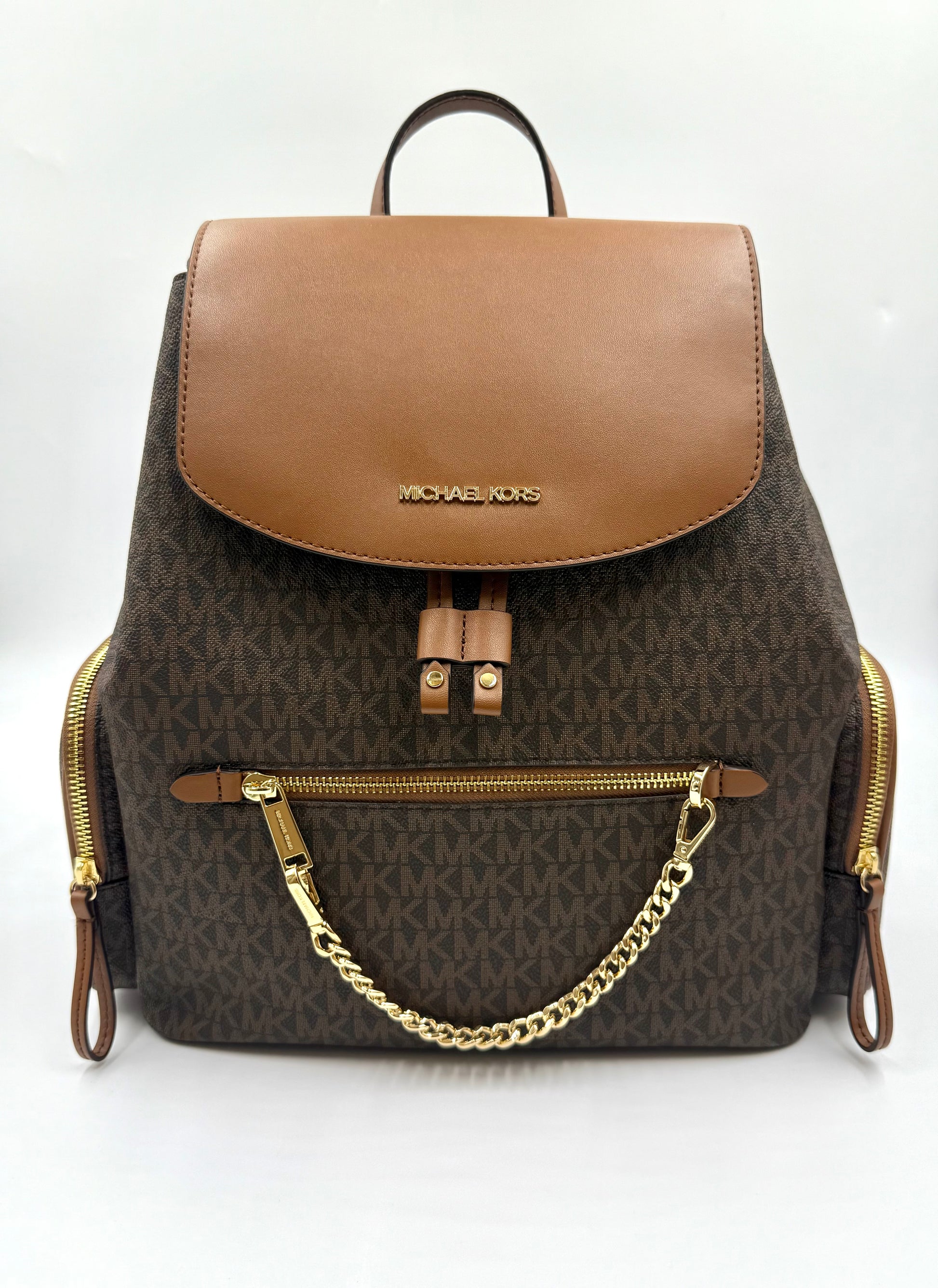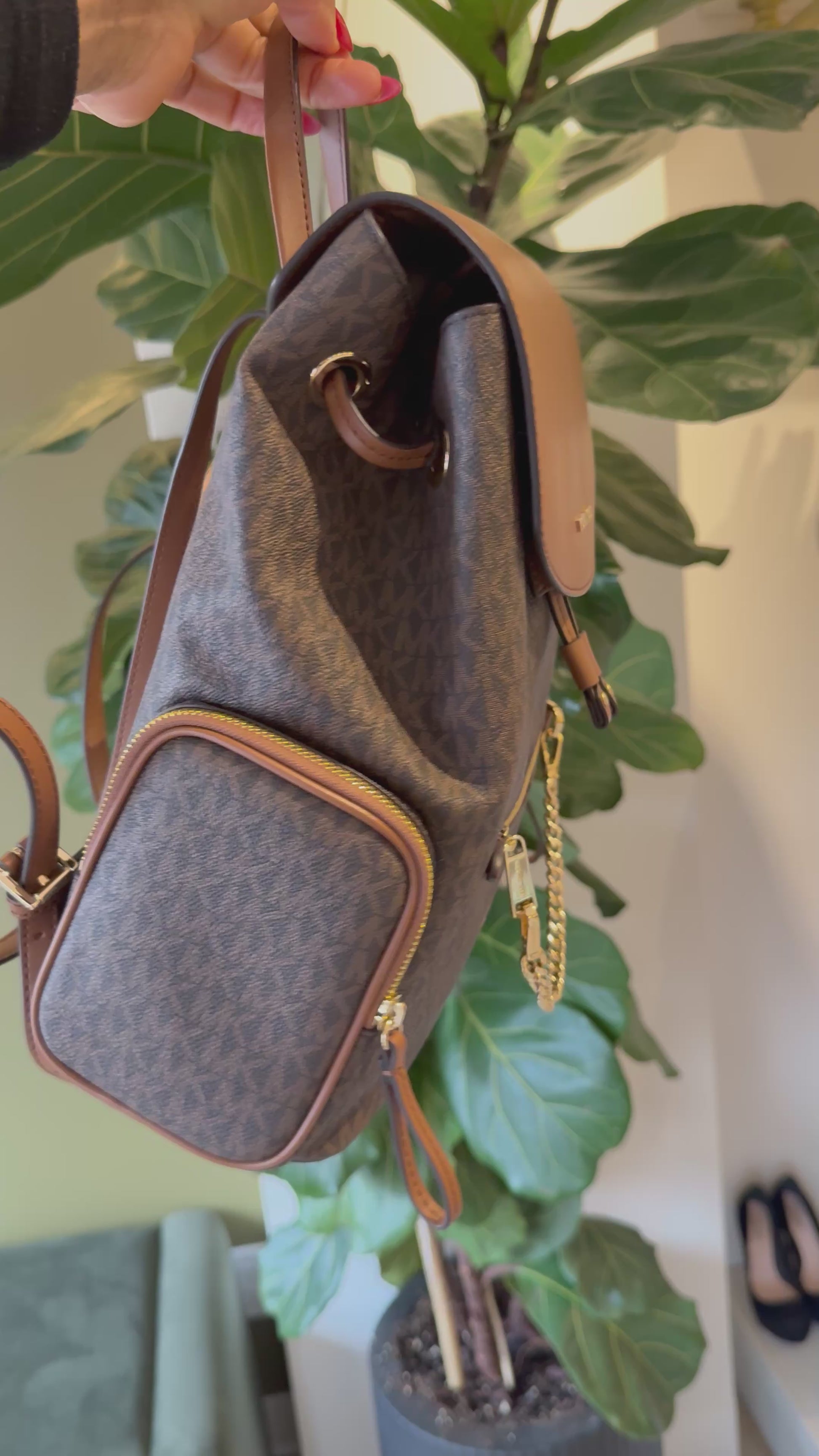 Logo print canvas Keepall backpack with drawstring and snap closure. Inside zip pocket. Exterior details: front zip pocket, 2 side pockets. Interior details: back zip pocket, 2 front slip pockets.