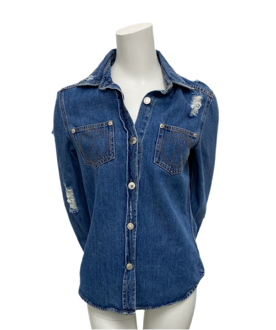Moschino Couture Blue Distressed Denim Shirt Size 6