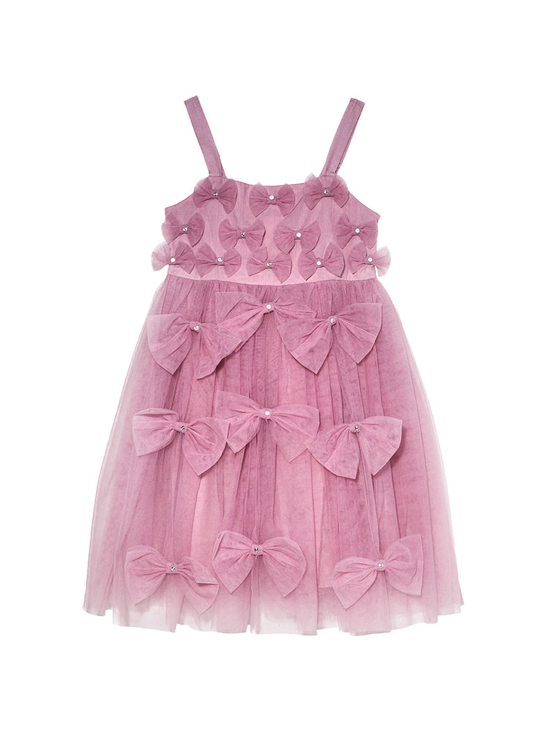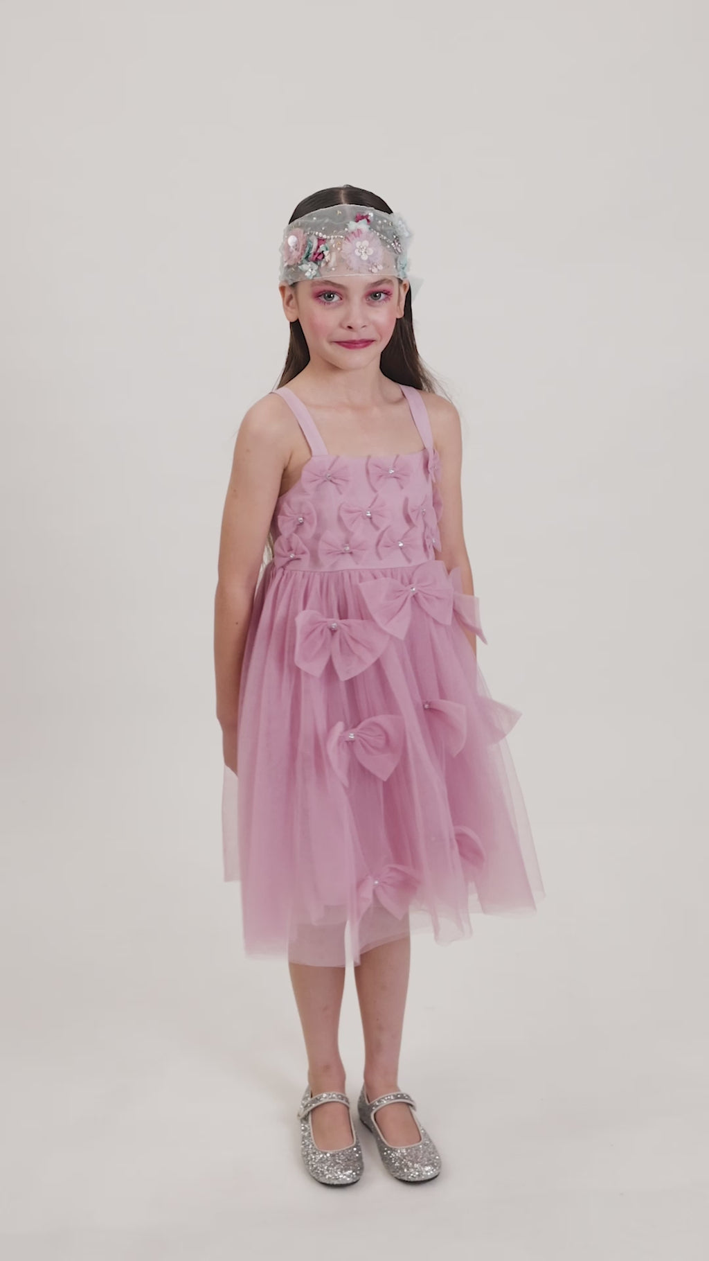 Hand applied sequin studded bows and scattered sequins adorn the front bodice, while oversized bows on the skirt bring a playful elegance. Elastic shirring at the back, this dress ensures both comfort and style.