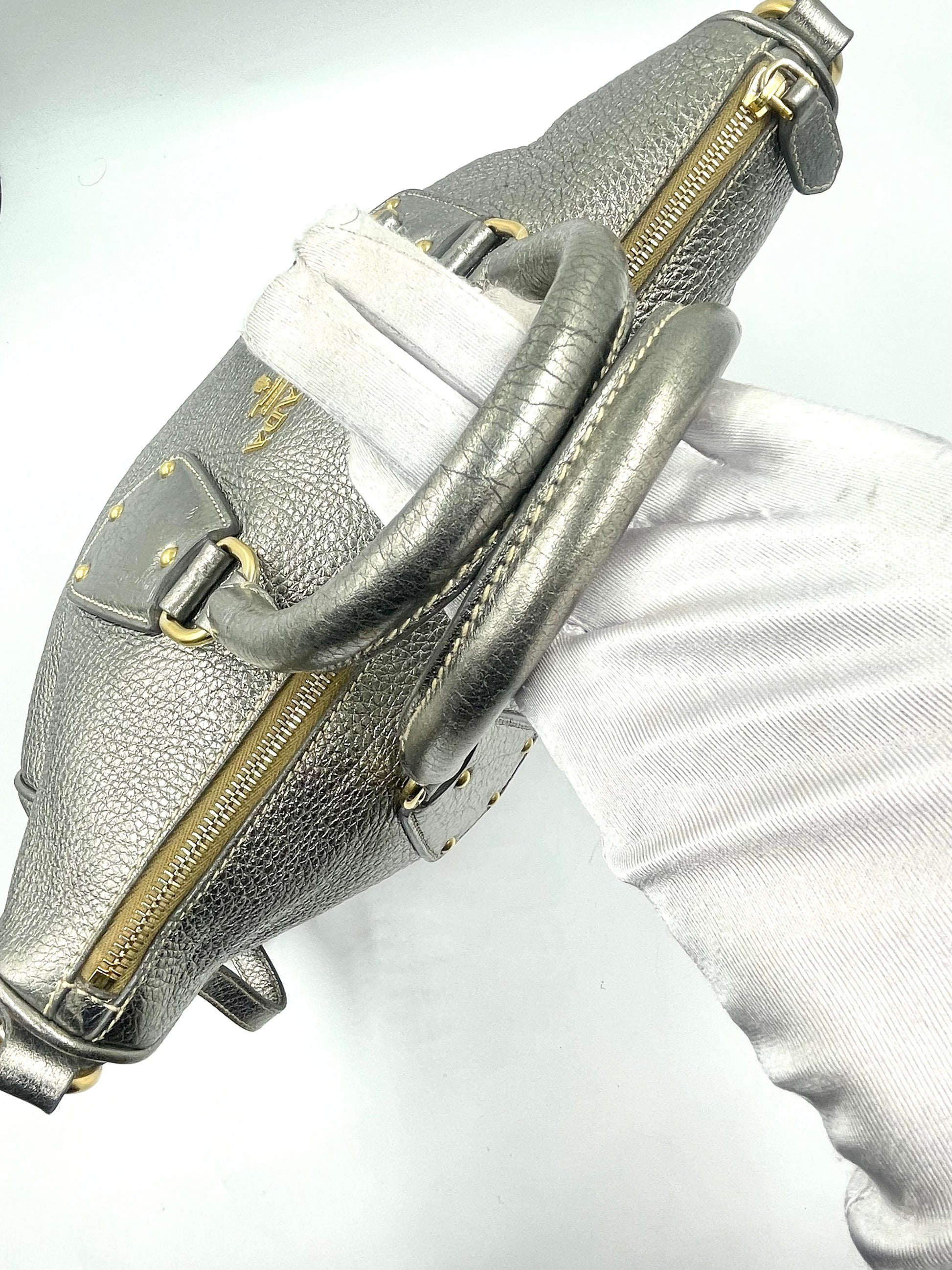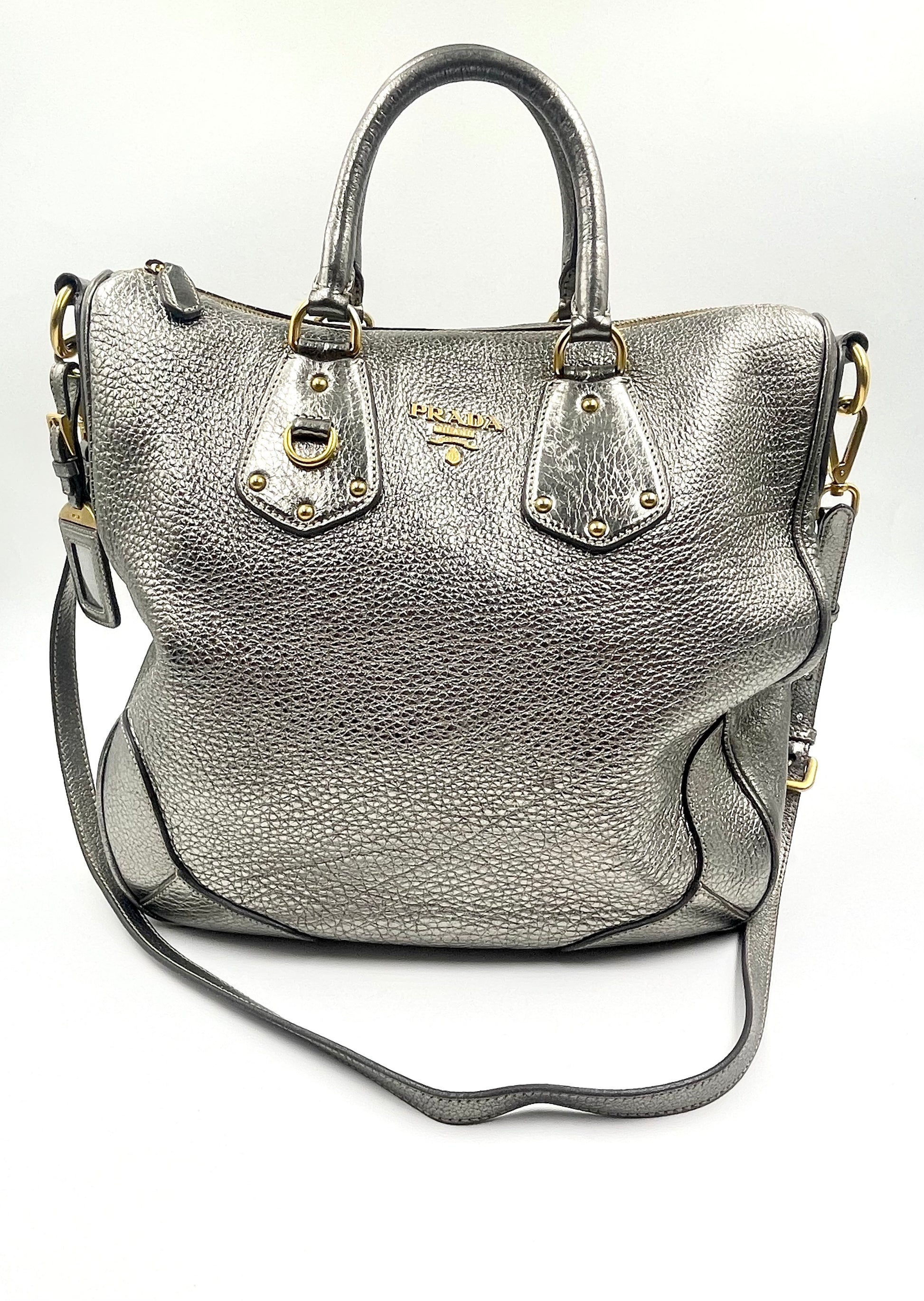 Prada metallic silver Vitello Daino tote featuring dual rolled top handles, zip top closure, gold tone hardware, logo hardware at front, removeable ID tag at side, textile lined interior compartment features one zip pocket and one slip pocket.