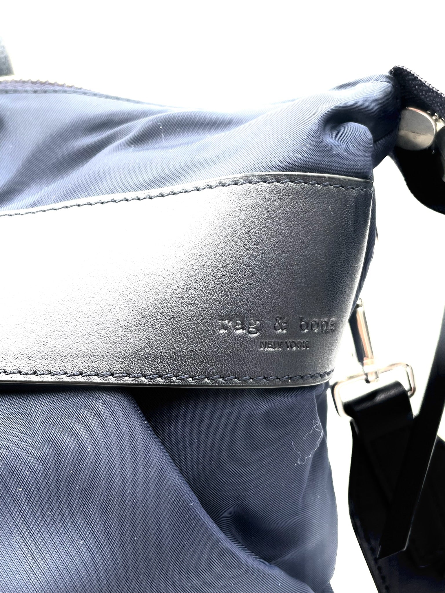 Top handle bag with single adjustable shoulder strap. Leather trim embellishment and dual exterior pockets. Canvas lining & three interior pockets. Top zip closure.