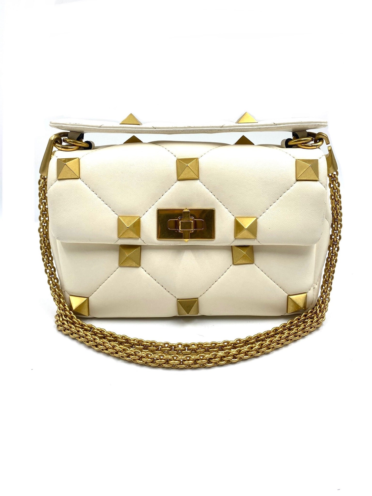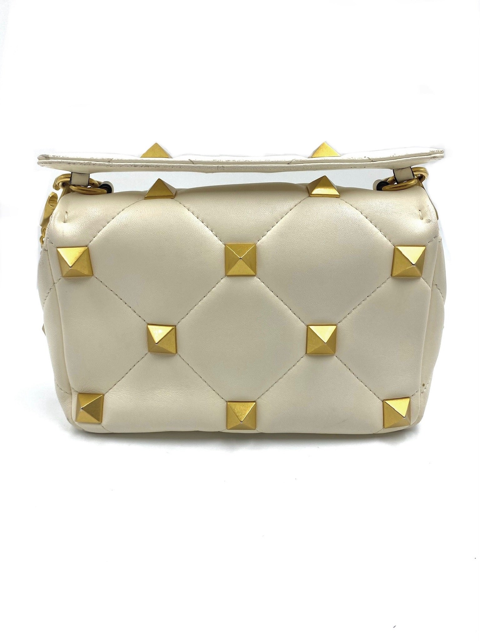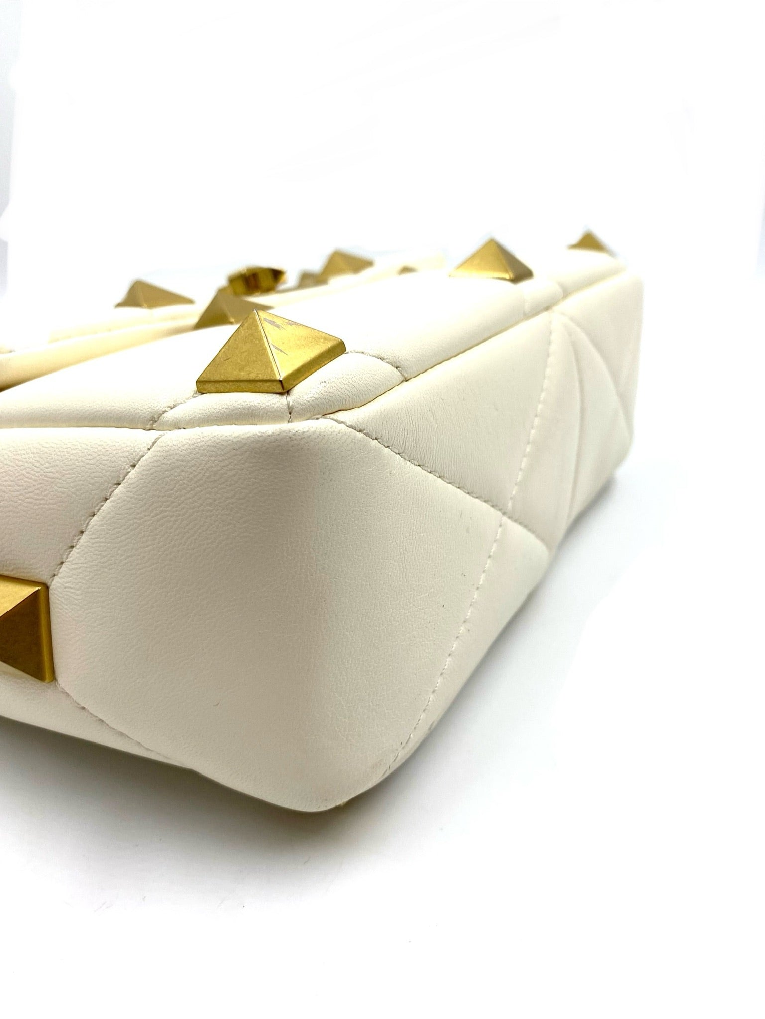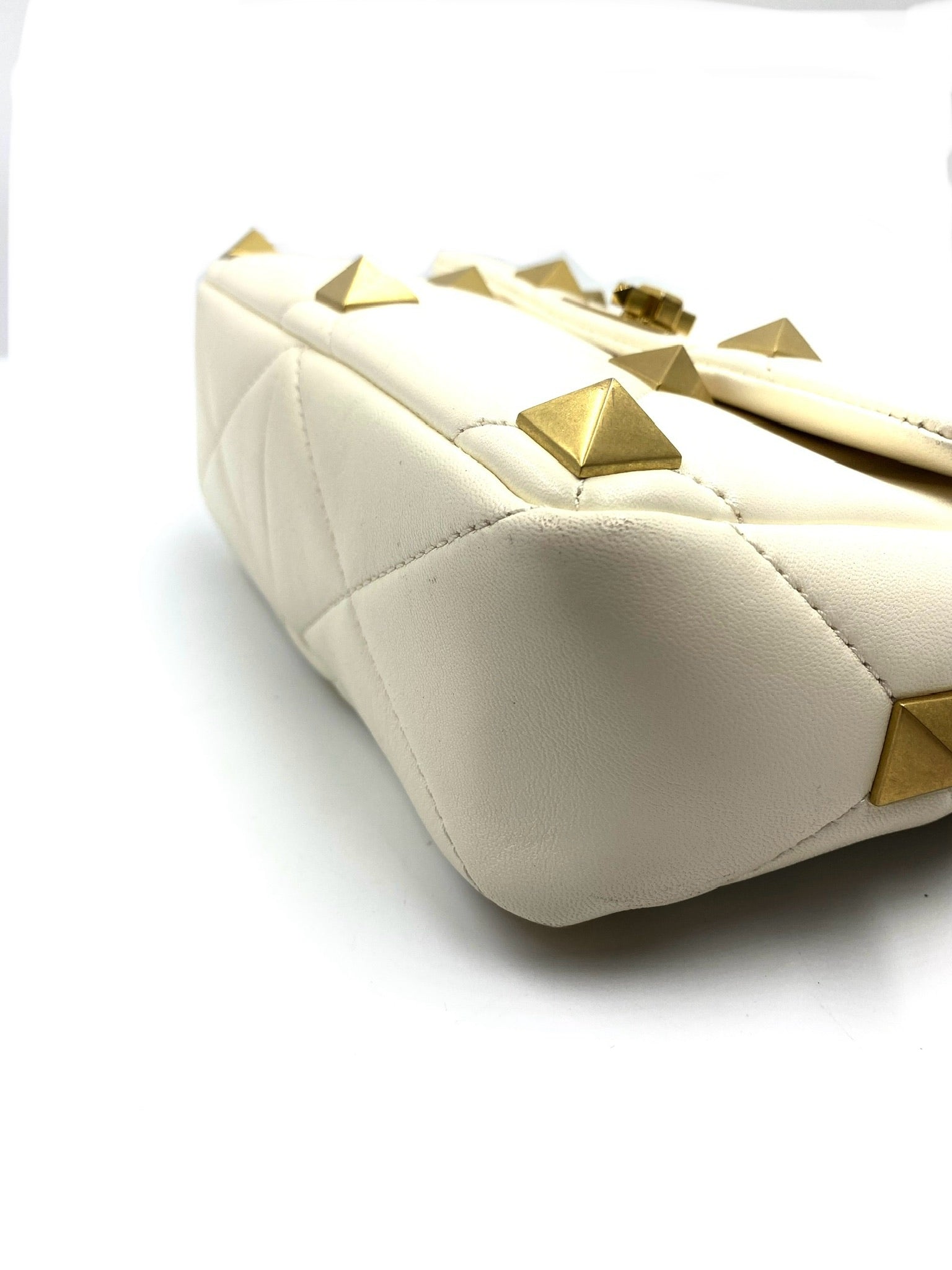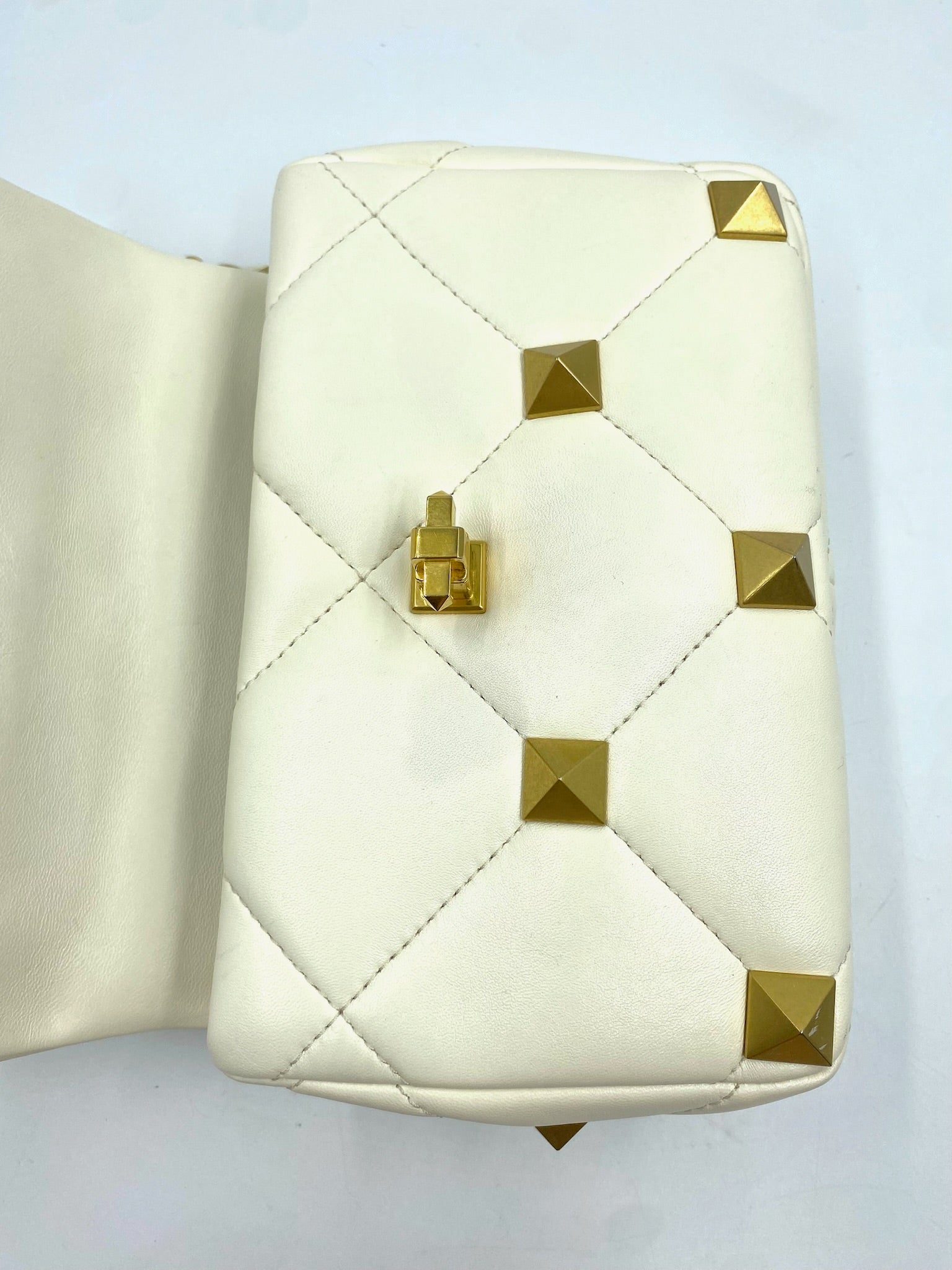 Studded flap bag with clasp closure. Good hardware. Inside slip and zip pocket compartment.