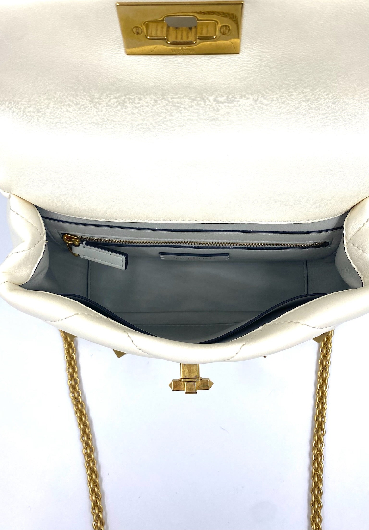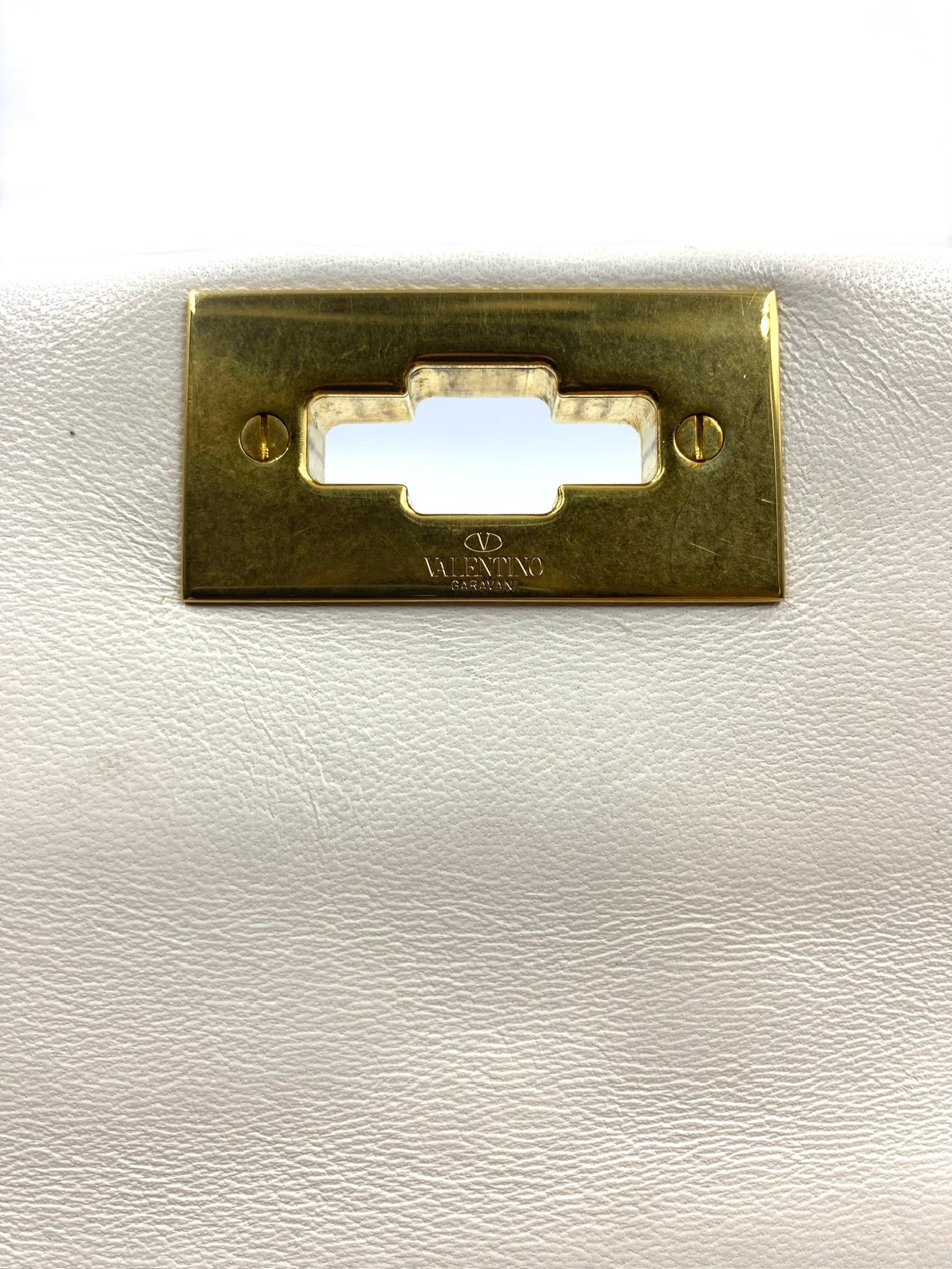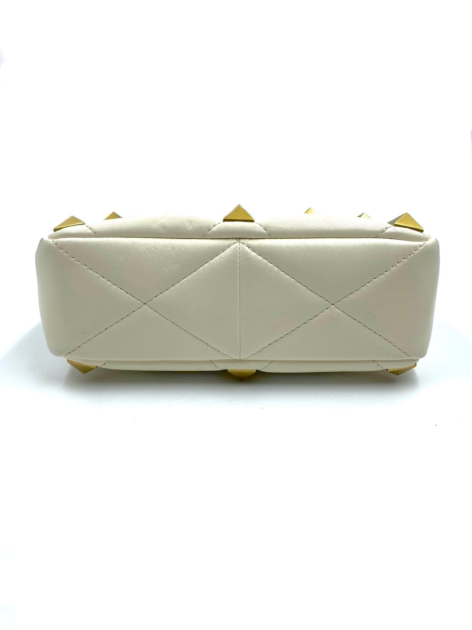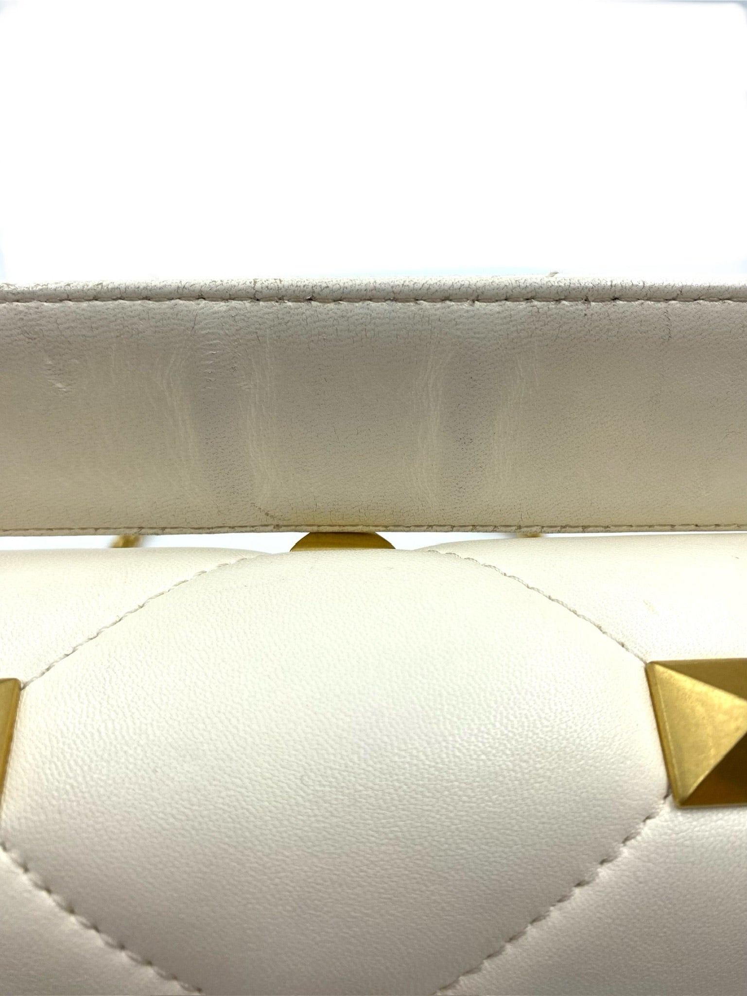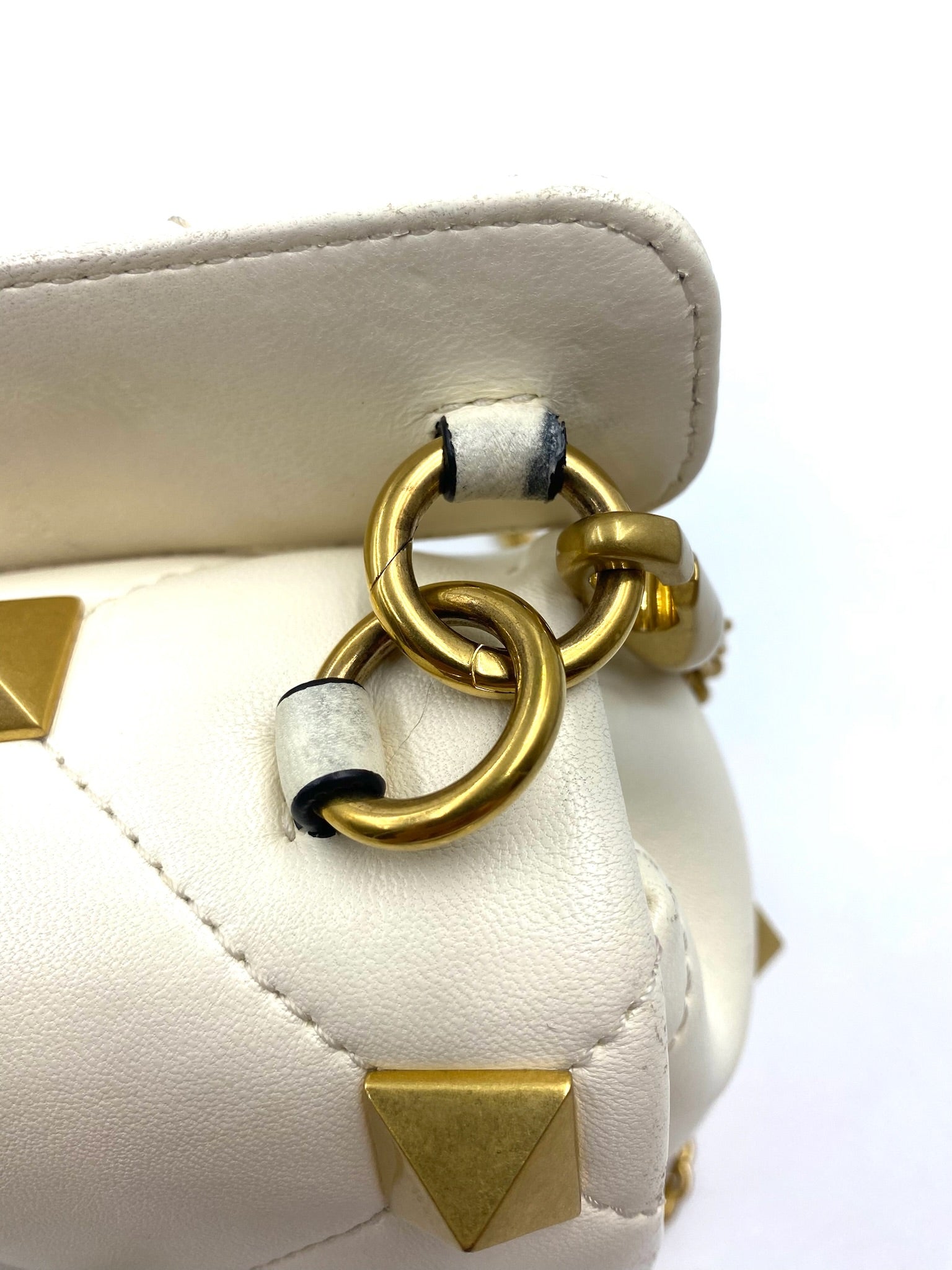 Studded flap bag with clasp closure. Good hardware. Inside slip and zip pocket compartment.
