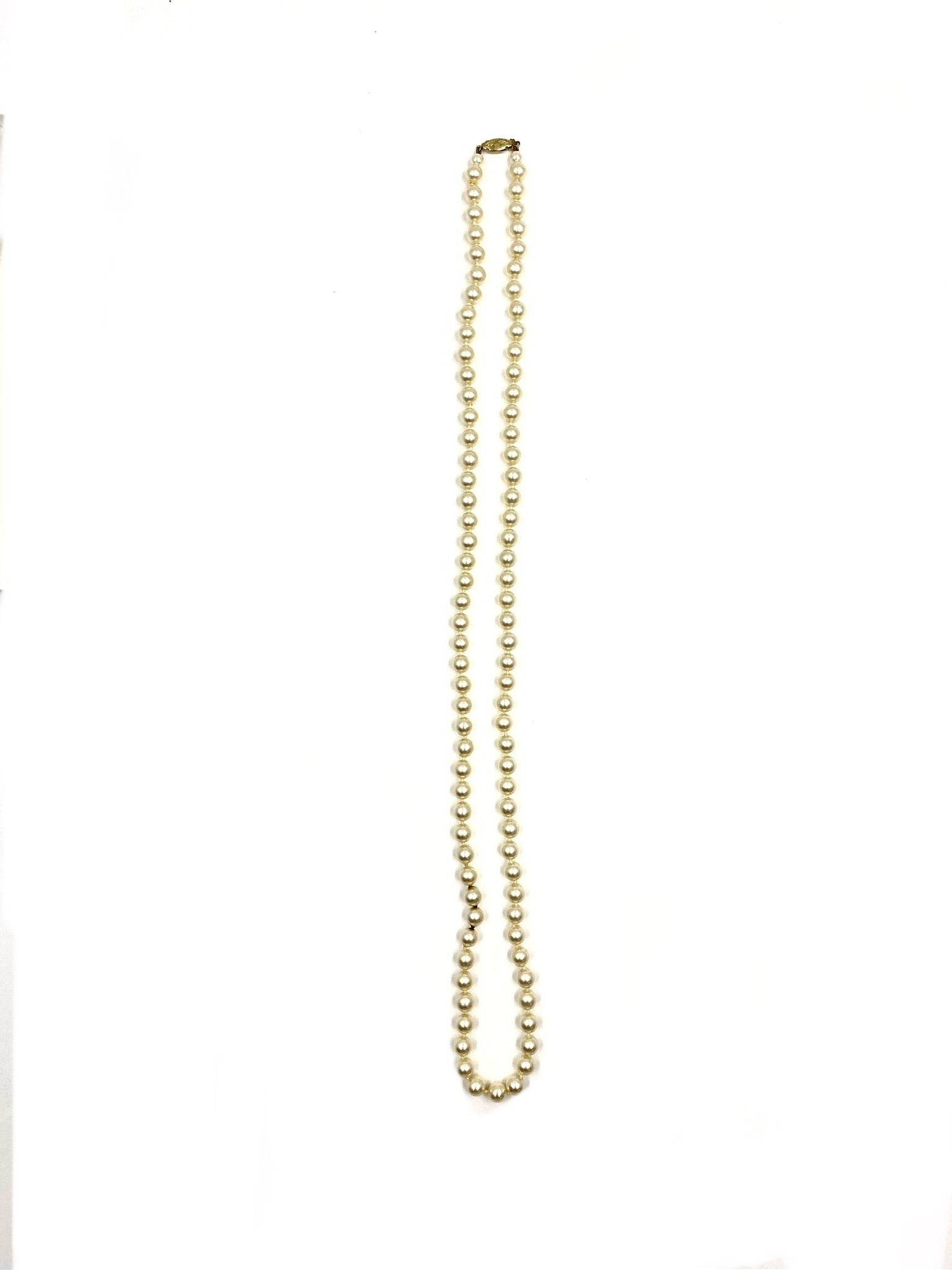 Faux pearl necklace with clasp closure. Some discolouration on some pearls.
