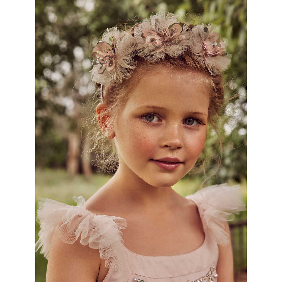 The trio of flowers is delicately created from layers of fine tulle and silver petal-like sequins to create blossoming blooms that sit atop a comfortable ribbon-encased headband.